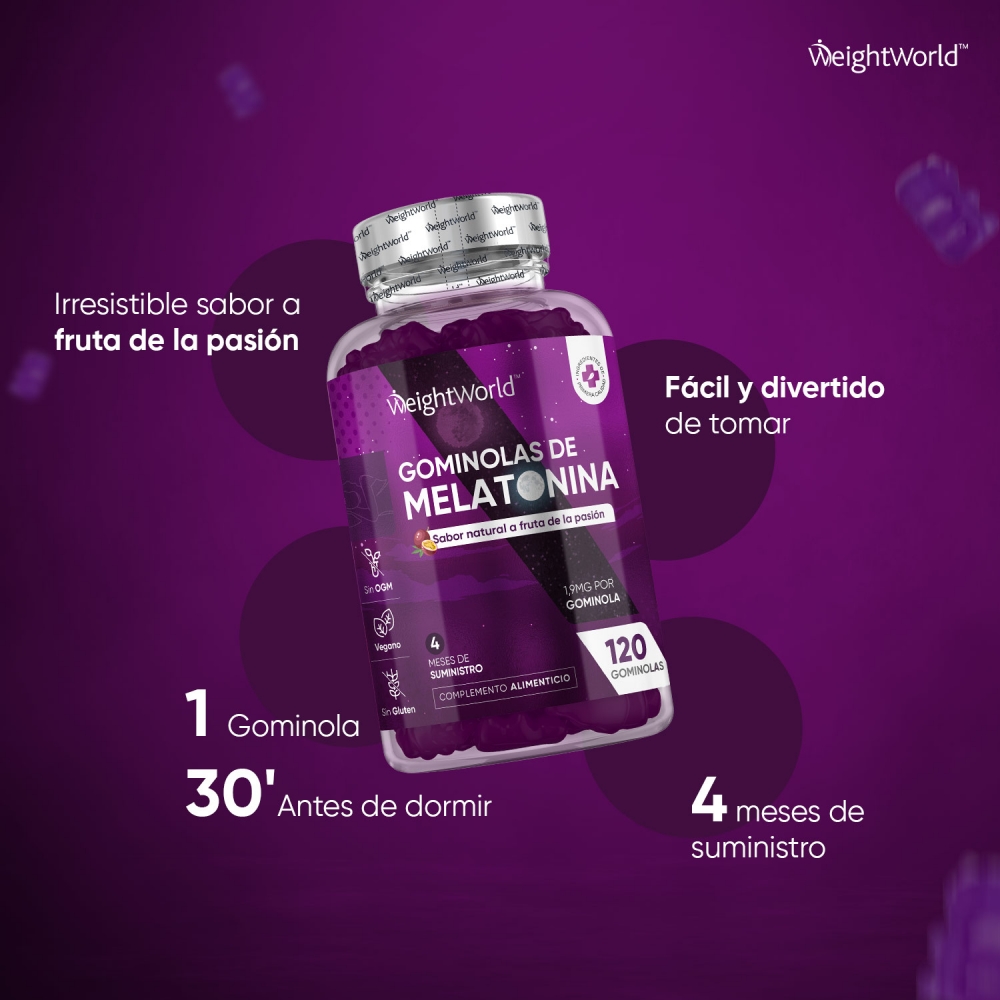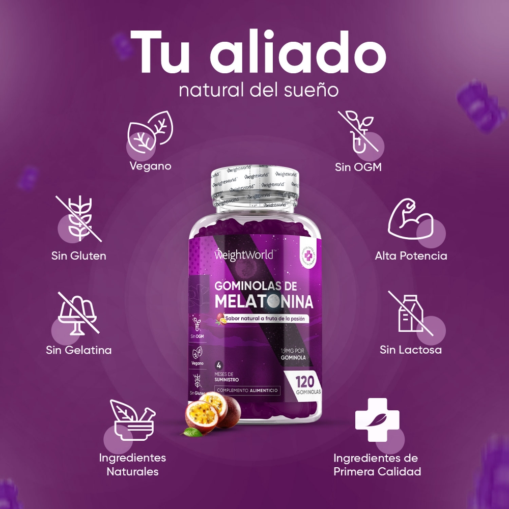 Cada envase contiene un total de 120 gummies para dormir con sabor a fruta de la pasión, por lo que ¡puedes hacerte una idea de lo sabrosas que están! Nuestro suplemento de melatonina natural garantiza un suministro suficiente para 4 meses. Además, es de efecto rápido, pues en solo 30 minutos tras la ingesta de una de estas gomitas sentirás cómo tu cuerpo se va preparando para disfrutar de un sueño profundo. Este complemento alimenticio es 100 % vegano, no contiene gluten ni OGM.