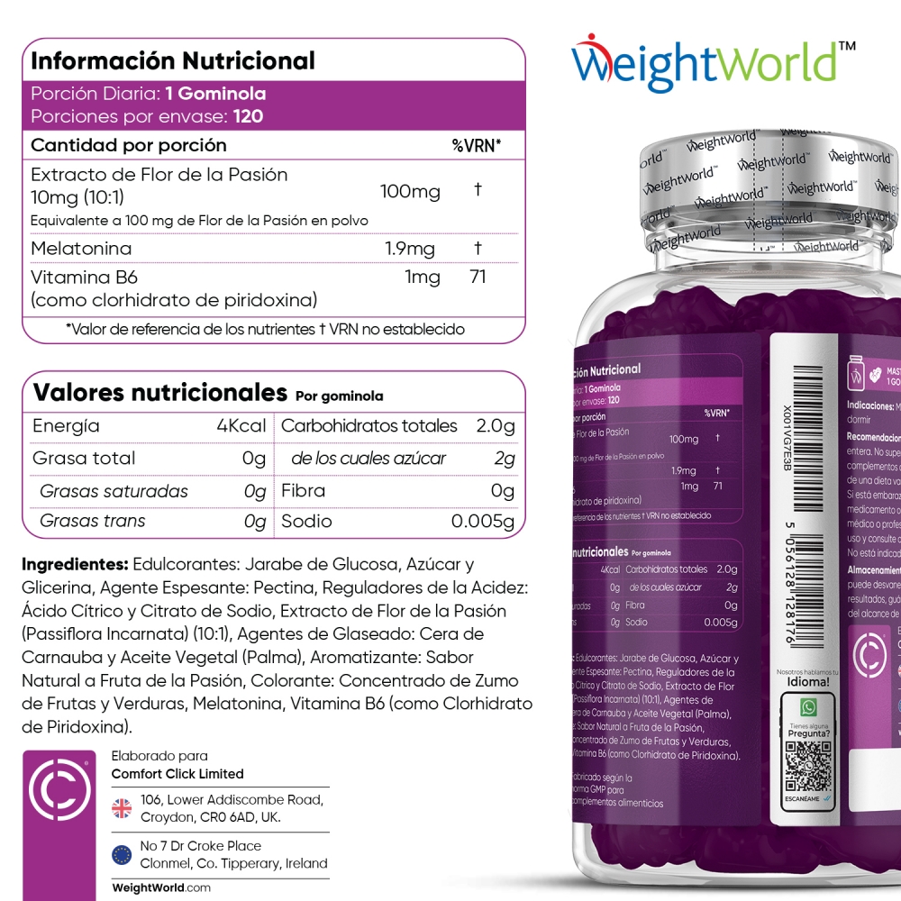 Edulcorantes: Jarabe de Glucosa, Azúcar y Glicerina, Agente Espesante: Pectina, Reguladores de la Acidez: Ácido Cítrico y Citrato de Sodio, Extracto de Flor de la Pasión (Passiflora Incarnata) (10:1), Agentes de Glaseado: Cera de Carnauba y Aceite Vegetal (Palma), Aromatizante: Sabor Natural a Fruta de la Pasión, Colorante: Concentrado de Zumo de Frutas y Verduras, Melatonina, Vitamina B6 (como Clorhidrato de Piridoxina).
