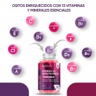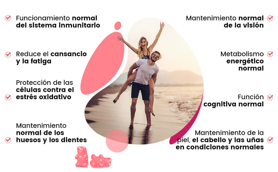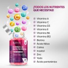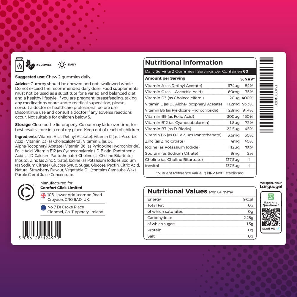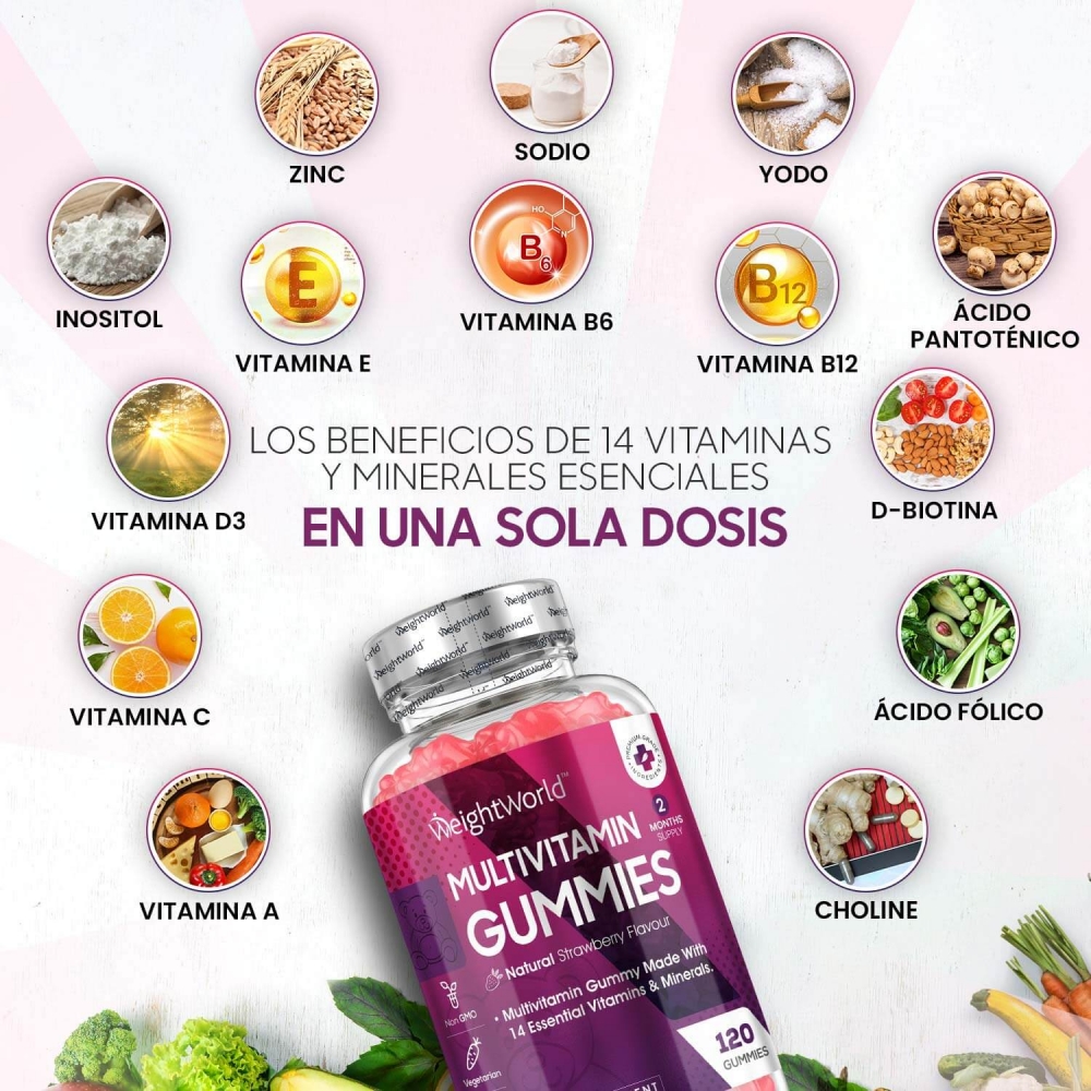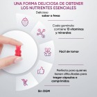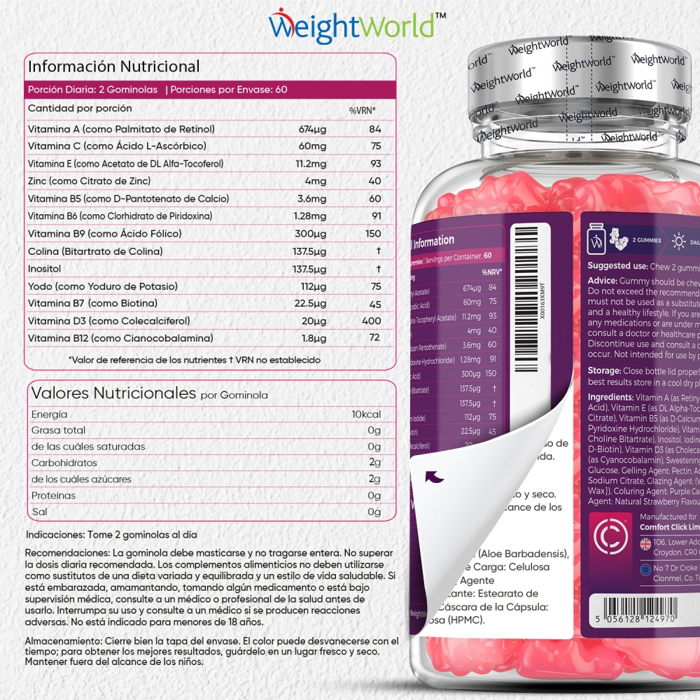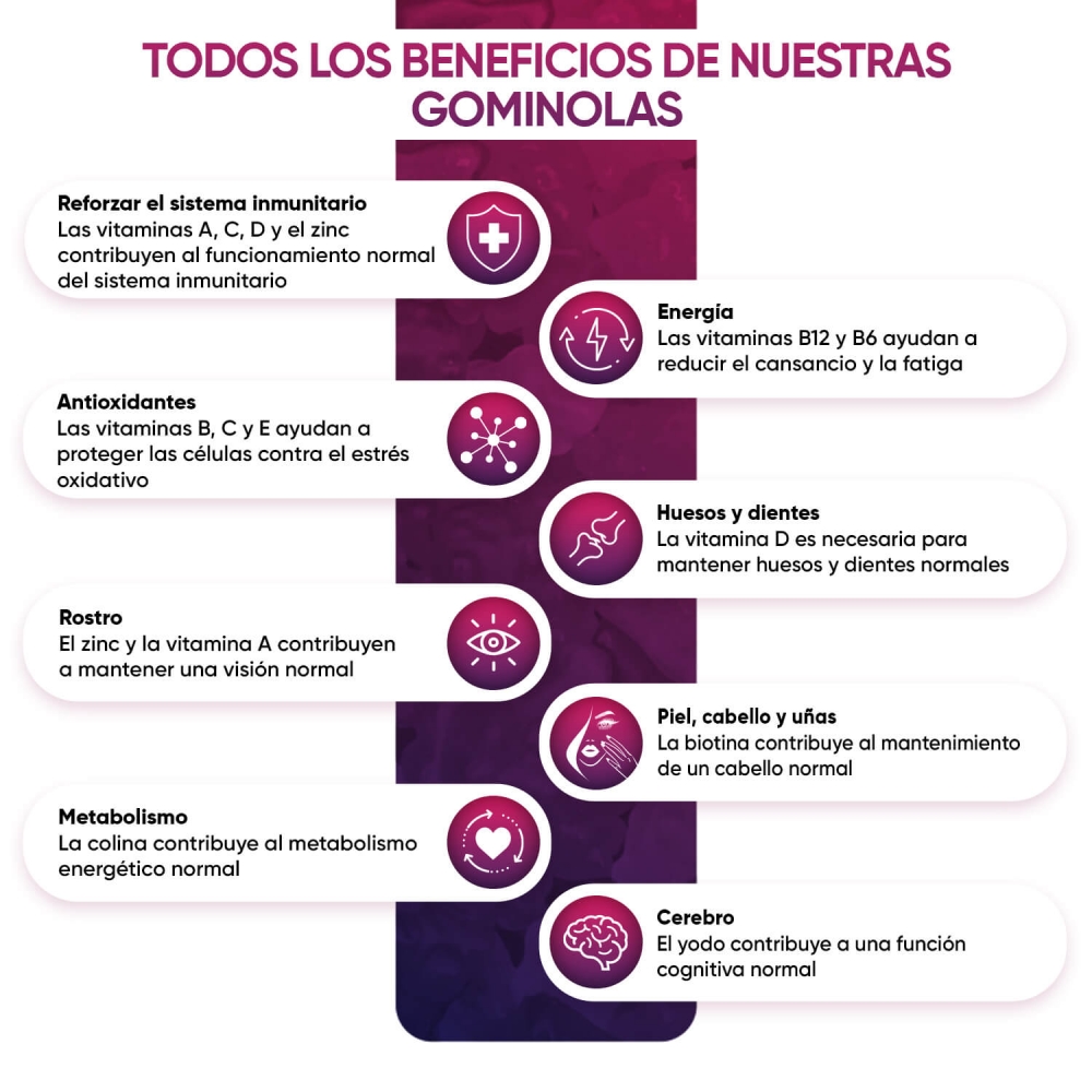 Vitamina A (como Palmitato de Retinol), Vitamina C (como Ácido L-Ascórbico), Vitamina E (como Acetato de DL Alfa-Tocoferol), Zinc (como Citrato de Zinc), Vitamina B5 (como Pantotenato D-Calcio), Vitamina B6 (como Clorhidrato de Piridoxina), Vitamina B9 (como Ácido Fólico), Colina (como Bitartrato de Colina), Inositol, Yodo (como Yoduro de Potasio), Vitamina B7 (como D-Biotina), Vitamina D3 (como Colecalciferol) (Fuente: Lanolina), Vitamina B12 (como Cianocobalamina), Edulcorantes: Azúcar, Jarabe de glucosa y Dextrosa, Agentes Gelificantes: Pectina y Glicerina, Reguladores de la Acidez: Ácido Cítrico y Citrato de Sodio, Agente de Glaseado: (Aceite Vegetal [Contiene Cera de Carnauba]) y Triglicéridos de Cadena Media (como Aceite MCT), Colorante: Concentrado de Zumo de Zanahoria Morado, Agente Aromatizante: Aroma Natural de Fresa.