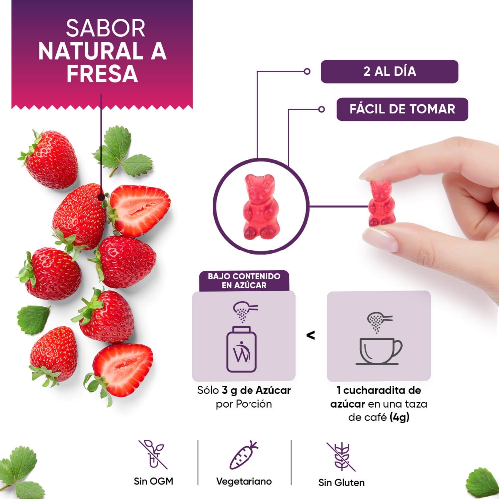 Cada envase contiene 120 gominolas con sabor a fresa natural para un suministro de 2 meses (2 gominolas al día). Es un suplemento sin gluten ni OGM apto para vegetarianos.