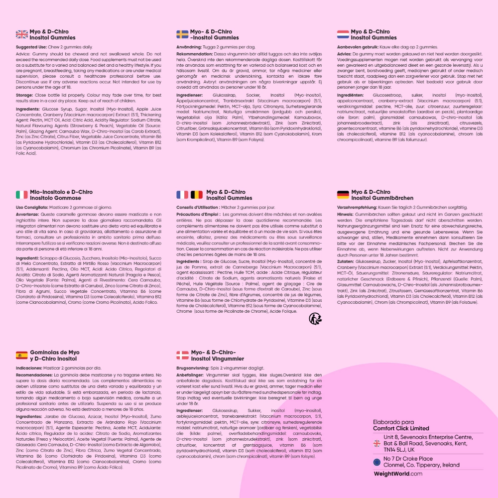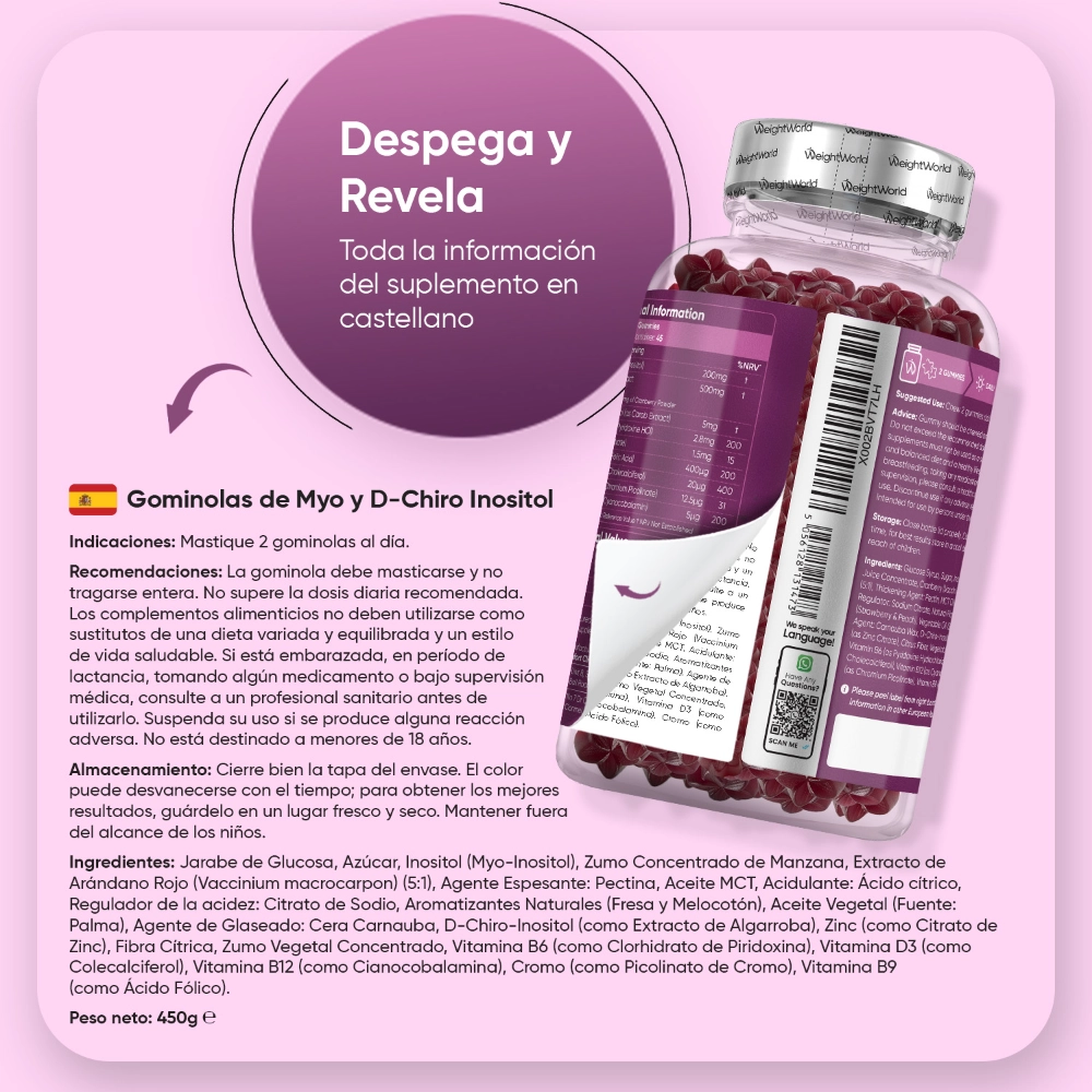Jarabe de Glucosa, Azúcar, Inositol (Myo-Inositol), Zumo Concentrado de Manzana, Extracto de Arándano Rojo (Vaccinium macrocarpon) (5:1), Agente Espesante: Pectina, Aceite MCT, Acidulante: Ácido cítrico, Regulador de la acidez: Citrato de Sodio, Aromatizantes Naturales (Fresa y Melocotón), Aceite Vegetal (Fuente: Palma), Agente de Glaseado: Cera Carnauba, D-Chiro-Inositol (como Extracto de Algarroba), Zinc (como Citrato de Zinc), Fibra Cítrica, Zumo Vegetal Concentrado, Vitamina B6 (como Clorhidrato de Piridoxina), Vitamina D3 (como Colecalciferol), Vitamina B12 (como Cianocobalamina), Cromo (como Picolinato de Cromo), Vitamina B9 (como Ácido Fólico).