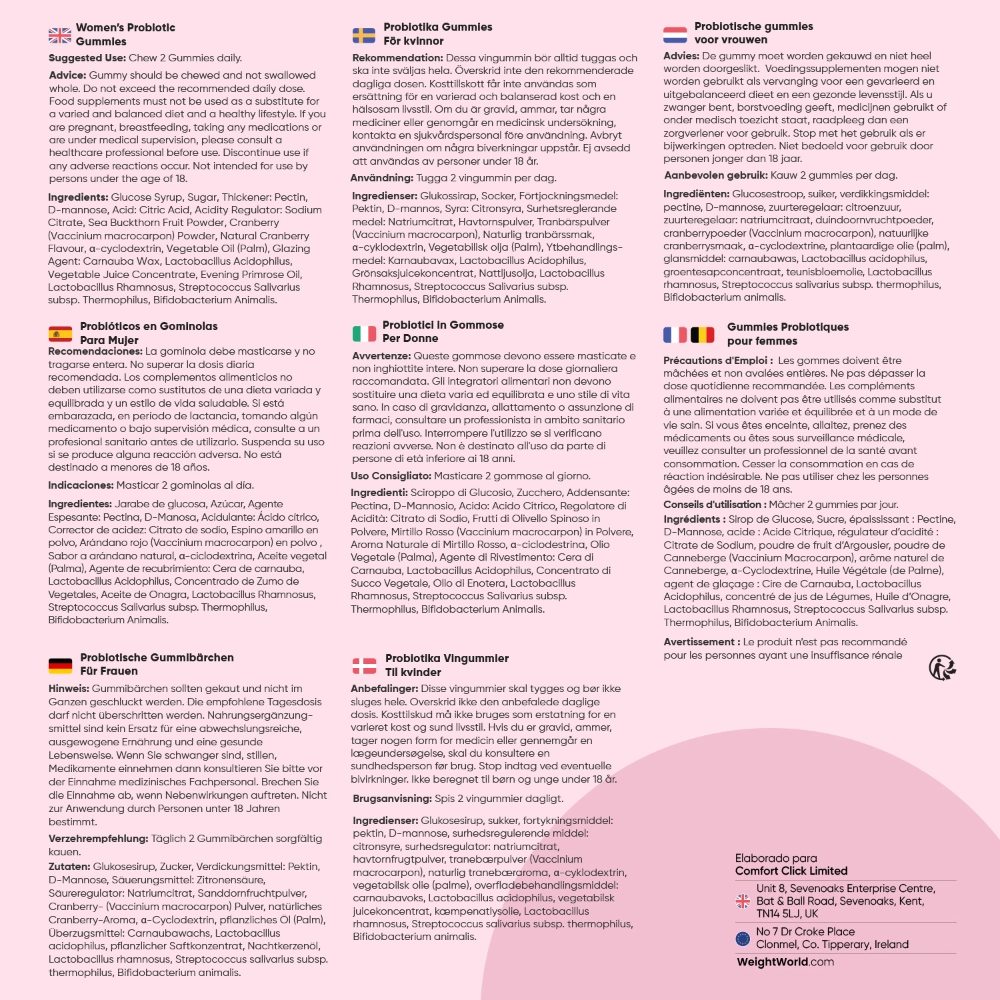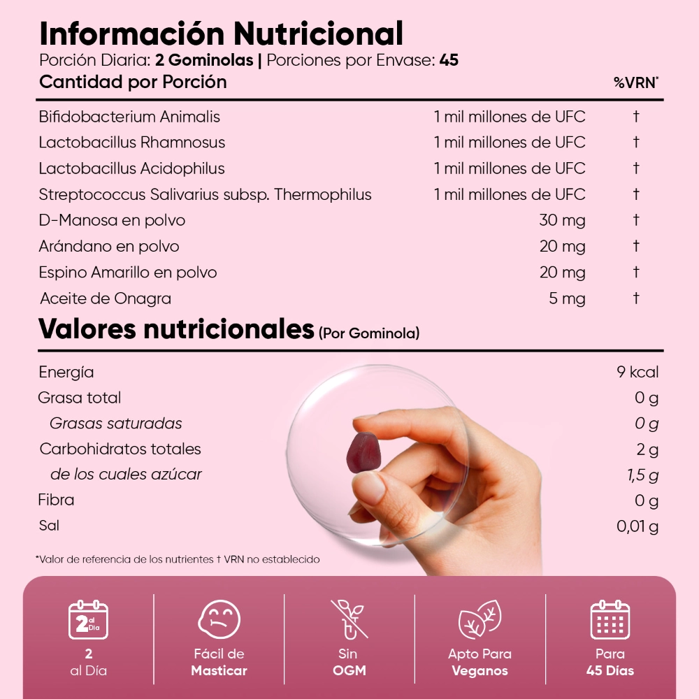 Jarabe de glucosa, Azúcar, Agente Espesante: Pectina, D-Manosa, Acidulante: Ácido cítrico, Corrector de acidez: Citrato de sodio, Espino amarillo en polvo, Arándano rojo (Vaccinium macrocarpon) en polvo , Sabor a arándano natural, α-ciclodextrina, Aceite vegetal (Palma), Agente de recubrimiento: Cera de carnauba, Lactobacillus Acidophilus, Concentrado de Zumo de Vegetales, Aceite de Onagra, Lactobacillus Rhamnosus, Streptococcus Salivarius subsp. Thermophilus, Bifidobacterium Animalis.