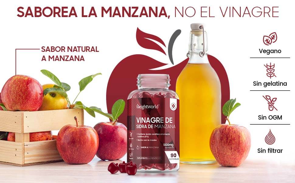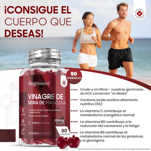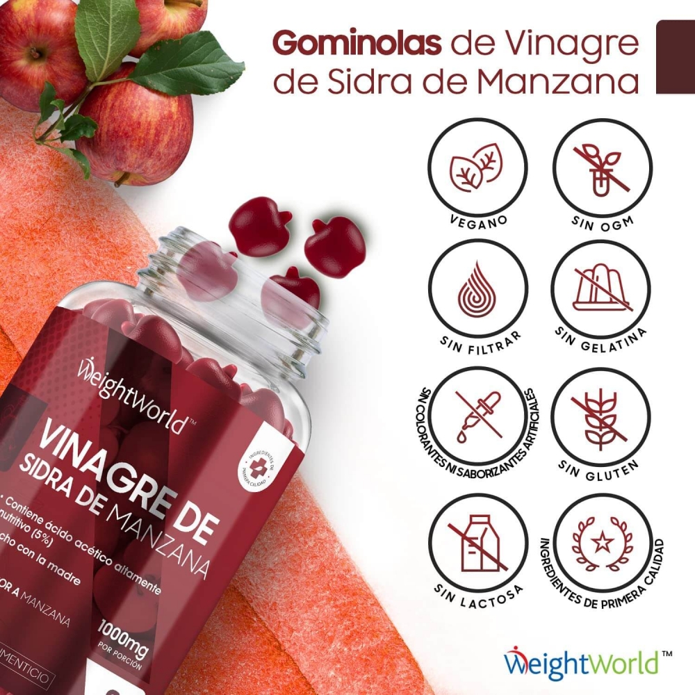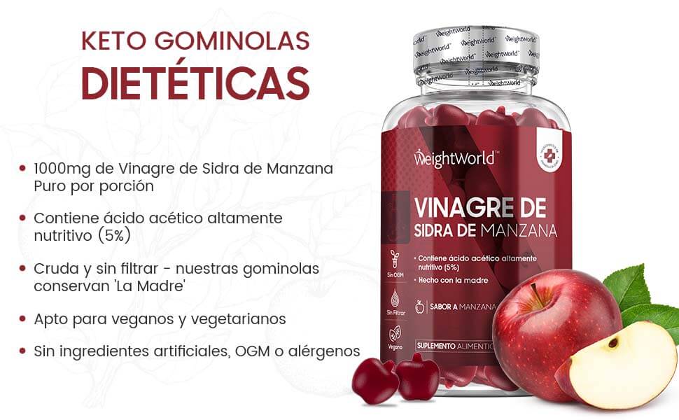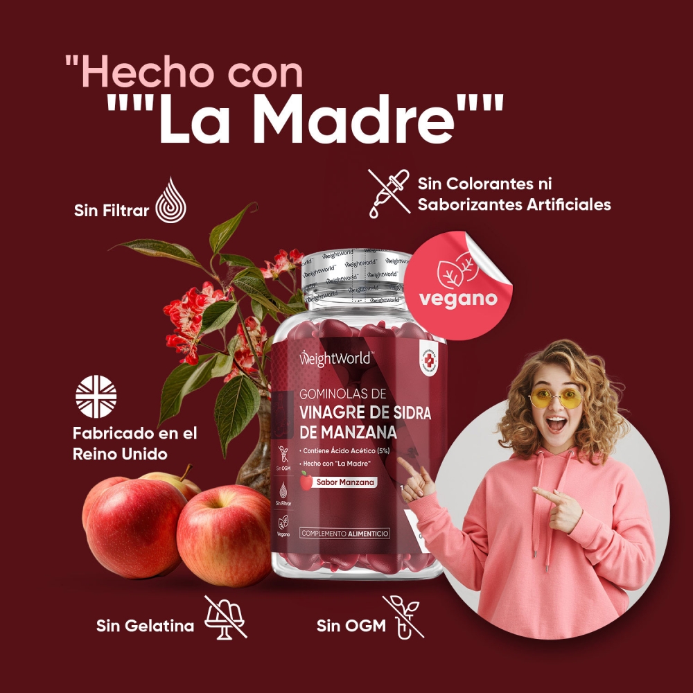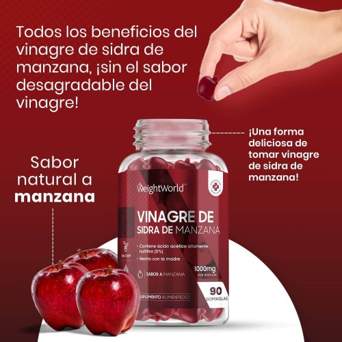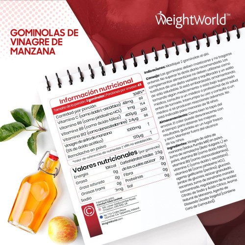 ¿Quieres incluir este ingrediente en tu rutina diaria pero has oído que no tiene un sabor muy agradable? Es cierto, el vinagre de sidra de manzana tiene un sabor algo picante. Por eso, WeightWorld te trae estas deliciosas gominolas de vinagre de sidra de manzana sin filtrar con sabor a manzana. Nuestra fórmula contiene 1000 mg de vinagre de sidra de manzana (equivalente a 5% de ácido acético) y también incorpora Vitamina C y Vitamina B6 y B9 para elevar tus niveles de energía.