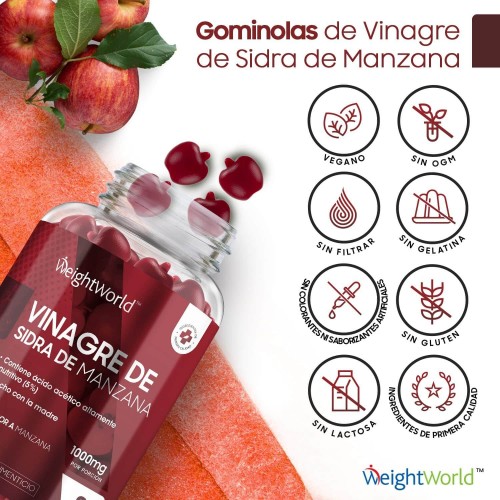 Las gominolas de Vinagre de Sidra de Manzana vienen avaladas por WeightWorld, tu marca de confianza presente en el mercado desde el año 2006. Más de 15 años de historia garantizan la máxima calidad de todos nuestros suplementos y productos, formulados con ingredientes de origen natural y sin OGM. Miles de clientes en más de una decena de países han depositado ya su confianza y bienestar en nosotros.