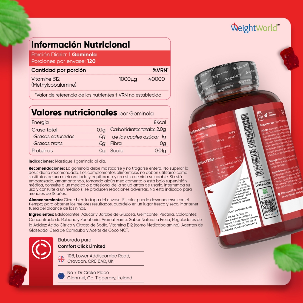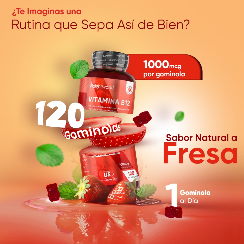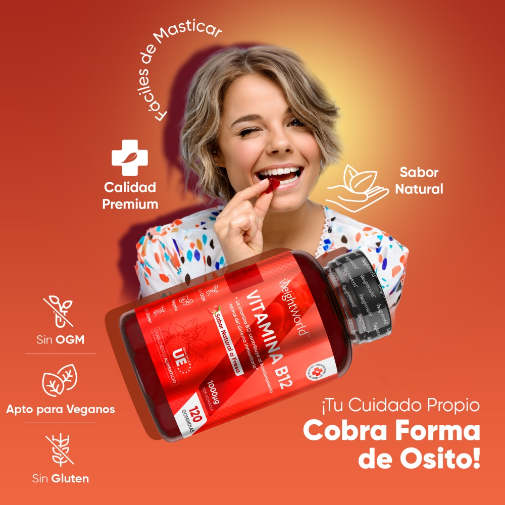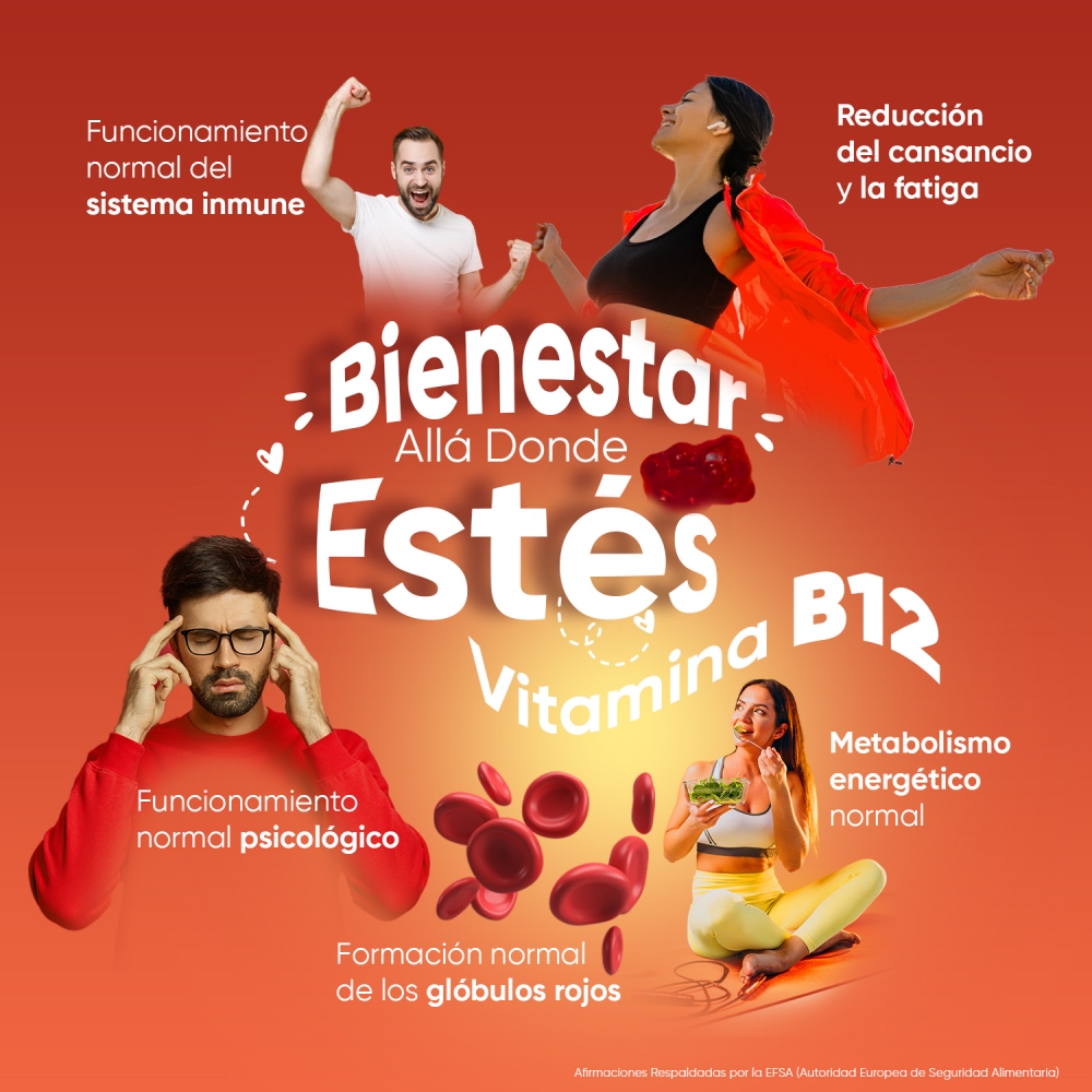 - Potente dosis de 1000 mcg de Vitamina B12 por gominola