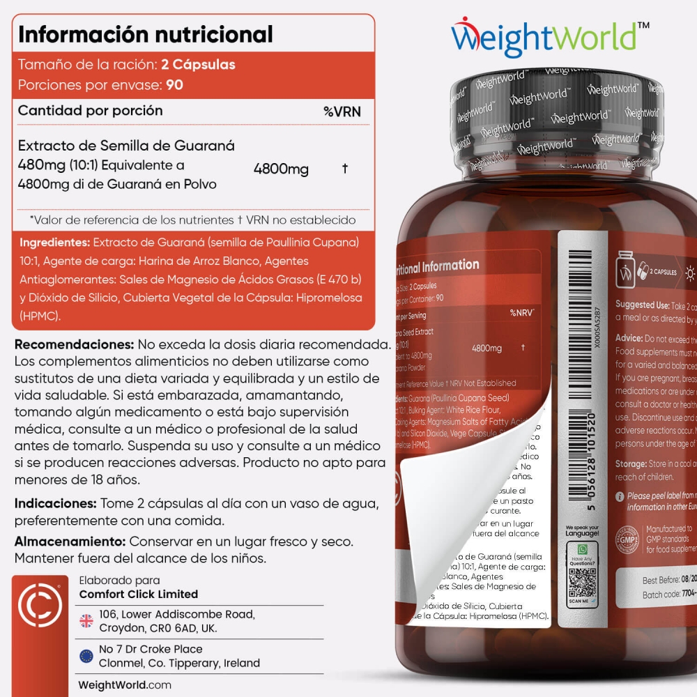 Las cápsulas de Guaraná Puro vienen avaladas por WeightWorld, tu marca de confianza presente en el mercado desde el año 2006. Más de 15 años de historia garantizan la máxima calidad de todos nuestros suplementos y productos, formulados con ingredientes de origen natural y sin OGM. Miles de clientes en más de una decena de países han depositado ya su confianza y bienestar en nosotros.