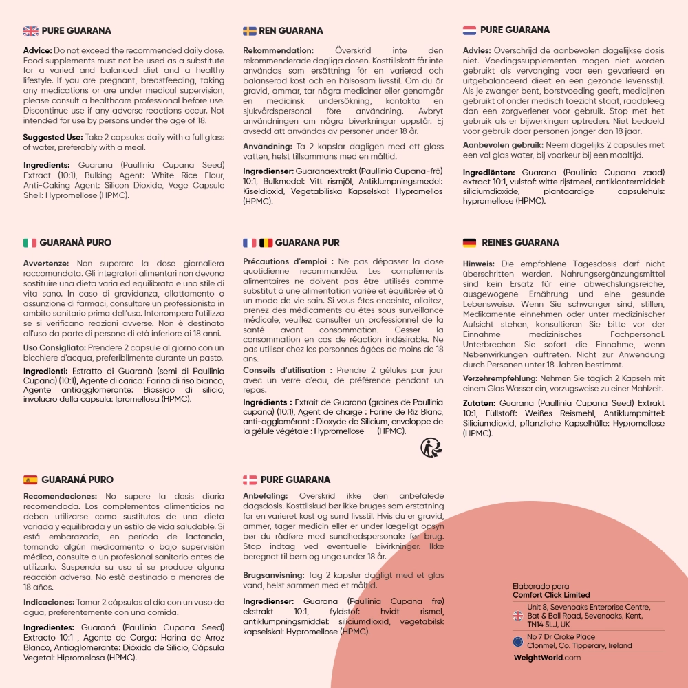 Extracto de Guaraná (semilla de Paullinia Cupana) 10:1, Agente de carga: Harina de arroz blanco, Agentes Antiaglomerantes: Dióxido de Silicio, Cubierta Vegetal de la Cápsula: Hipromelosa (HPMC).