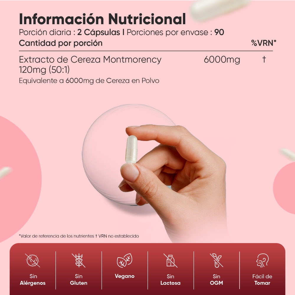 - Cereza Montmorency - Aprovecha los beneficios de las cerezas, una de las fuentes más ricas en antocianinas naturales antioxidantes y antiinflamatorias para cuidar tu bienestar, aumentando el sistema inmunológico.
