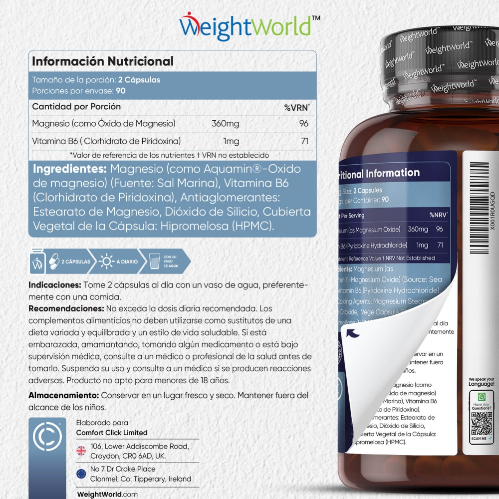 Magnesio (como Aquamin® - Óxido de magnesio) (Fuente: Sal Marina), Vitamina B6 (Clorhidrato de Piridoxina), Antiaglomerantes: Dióxido de Silicio, Cubierta Vegetal de la Cápsula: Hipromelosa (HPMC).