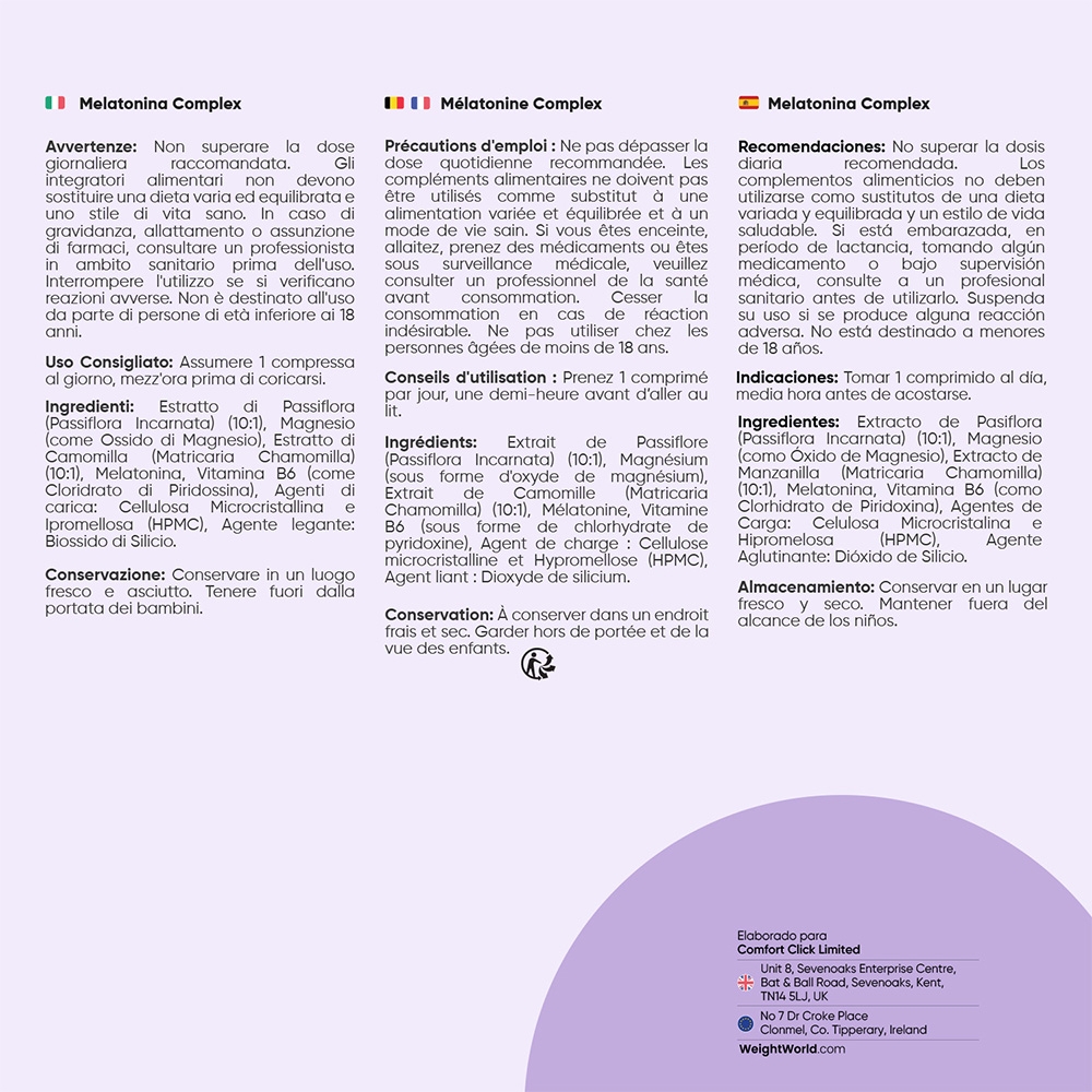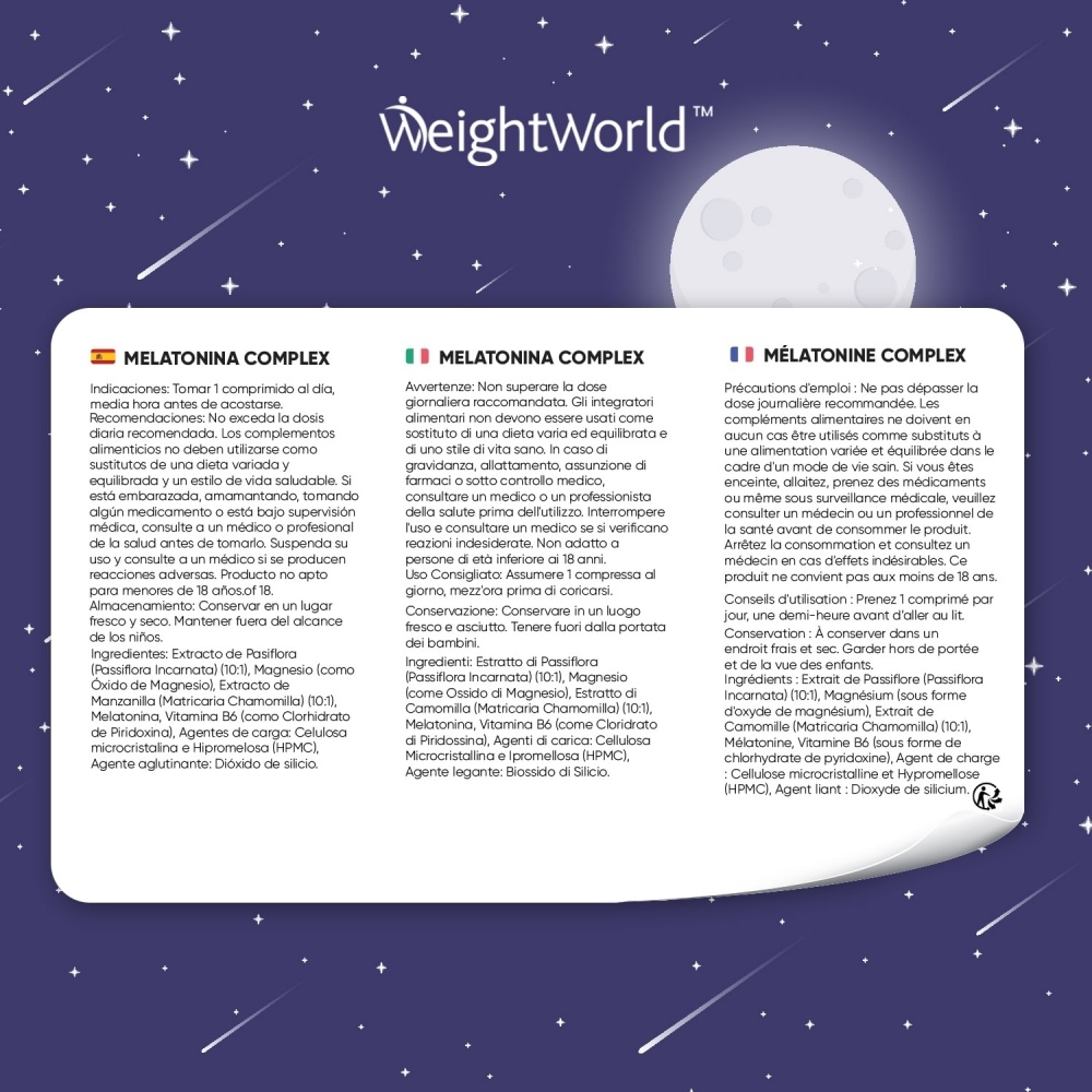 Los comprimidos de Melatonina Complex 1 mg vienen avalados por WeightWorld, tu marca de confianza presente en el mercado desde el año 2006. Estas son las características que hacen único a este suplemento: