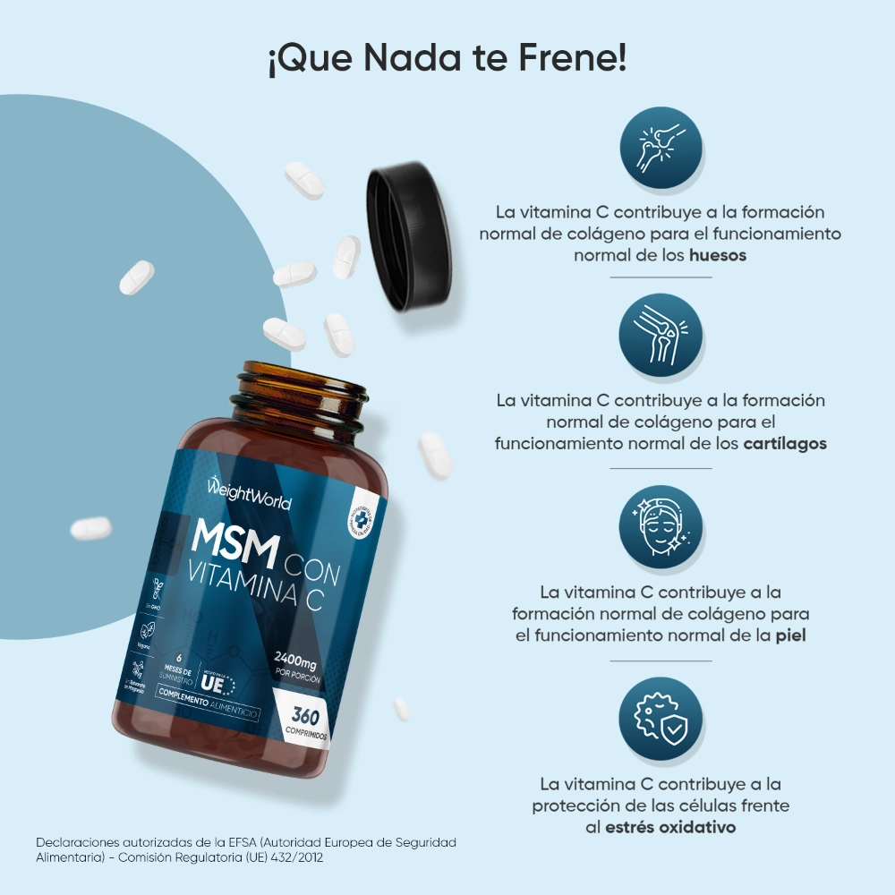 Descubre el suplemento de MSM con Vitamina C de WeightWorld, que combina los beneficios del MSM (2400 mg por porción) con las propiedades de la vitamina C. La inclusión de la vitamina C (100 mg por porción) contribuye a la formación normal de colágeno para el funcionamiento normal del cartílago* y de los huesos, de acuerdo con la Autoridad Europea de Seguridad Alimentaria (EFSA). Además, contribuye a la protección de las células frente al estrés oxidativo y a mantener el funcionamiento normal del sistema inmunitario durante y después del ejercicio físico intenso*.