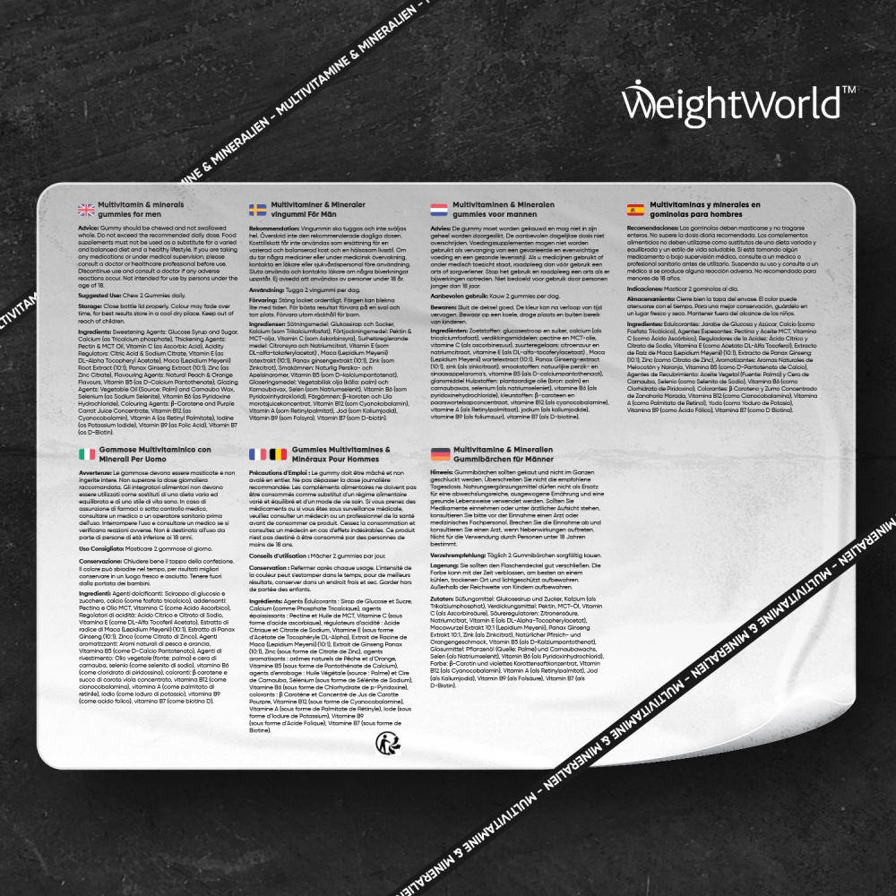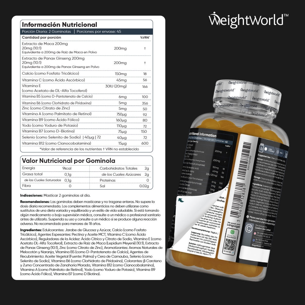 Edulcorantes: Jarabe de Glucosa y Azúcar, Calcio (como Fosfato Tricálcico), Agentes Espesantes: Pectina y Aceite MCT, Vitamina C (como Ácido L-Ascórbico), Reguladores de la Acidez: Ácido Cítrico y Citrato de Sodio, Vitamina E (como Acetato DL-Alfa Tocoferol), Extracto de Raíz de Maca (Lepidium Meyenii) (10:1), Extracto de Panax Ginseng (10:1), Zinc (como Citrato de Zinc), Aromatizantes: Aromas Naturales de Melocotón y Naranja, Vitamina B5 (como D-Pantotenato de Calcio), Agentes de Recubrimiento: Aceite Vegetal (Fuente: Palma) y Cera de Carnauba, Selenio (como Selenito de Sodio), Vitamina B6 (como Clorhidrato de Piridoxina), Colorantes: β Caroteno y Zumo Concentrado de Zanahoria Morada, Vitamina B12 (como Cianocobalamina), Vitamina A (como Palmitato de Retinol), Yodo (como Yoduro de Potasio), Vitamina B9 (como Ácido Fólico), Vitamina B7 (como D Biotina).