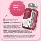 Edulcorantes: Jarabe de Glucosa y Azúcar, Calcio (como Fosfato Tricálcico), Agentes Espesantes: Pectina y Aceite MCT, Vitamina E (como Acetato de DL-Alfa Tocoferol), Vitamina C (cómo Ácido Ascórbico), Reguladores de la Acidez: Ácido Cítrico y Citrato de soDIO, Aromatizantes: Aromas Naturales de Frambuesa y Fresa, Coenzima Q10 (como Ubidecarenona), Ácido Hialurónico (como Hialuronato de Sodio), Aceite de Onagra (Oenothera Biennis), Agentes de Recubrimiento: Aceite Vegetal (Fuente: Palma) y Cera de Carnauba, Colorantes: (Zumo Concentrado de Zanahoria Morada), Zinc (como Citrato de Zinc), Vitamina B6 (como Clorhidrato de Piridoxina), Vitamina A (como Palmitato de Retinol), Yodo (como Yoduro de Potasio), Vitamina B12 (como Cianocobalamina), Vitamina B9 (como Ácido Fólico), Vitamina B7 (como D Biotina).