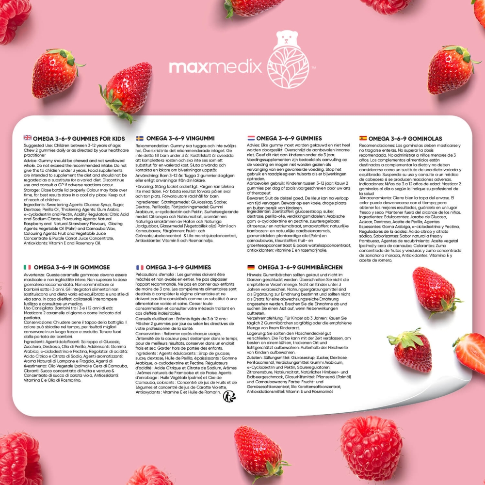 Las Gominolas de Omega 3, 6 y 9 para Niños de Maxmedix son las mejores aliadas durante la etapa de desarrollo y crecimiento de los peques en edad escolar. Estos tres ácidos grasos esenciales cumplen un rol fundamental en muchas funciones del organismo: favorecen el desempeño del sistema nervioso, estimulan el rendimiento cerebral y también tienen un papel clave en la salud ocular, cardiovascular y de las articulaciones.