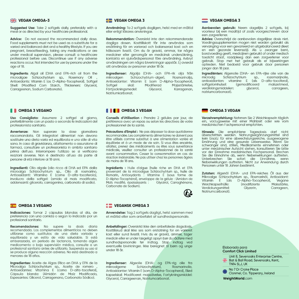 Aceite de Algas (aceite rico en DHA y EPA procedente de la Microalga Schizochytrium sp., Aceite de Romero, Antioxidantes: Vitamina E (como D-alfa-tocoferol), Cápsula Blanda: (Almidón de Maíz Modificado, Espesantes: Glicerol, Carragenina, Carbonato Sódico).