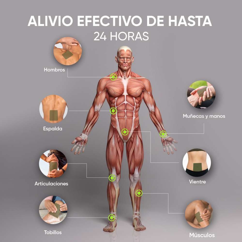 - Reducen el dolor crónico, la inflamación y el estrés (para efectos sistémicos, aplicar el parche en el abdomen)
