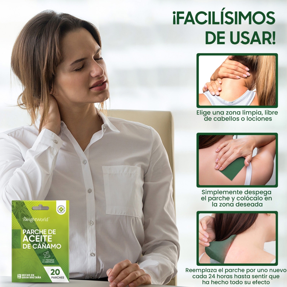 Los parches de aceite de cáñamo de WeightWorld están concebidos para aliviar el dolor de articulaciones, músculos o espalda de una manera sencilla y 100 % segura. Dada su concentración en aceite de semillas de cáñamo, podrás calmar las molestias en las áreas doloridas de tu cuerpo, como los tobillos o las muñecas también. Su uso es muy simple, pues basta con colocar un parche en el área de interés y dejarlo durante 24 horas para comprobar su efecto calmante.