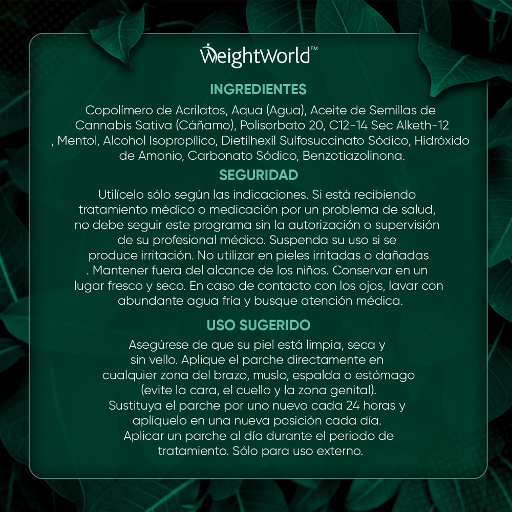 Los parches de aceite de cáñamo para el dolor vienen avalados por WeightWorld, tu marca de confianza presente en el mercado desde el año 2006. Más de 15 años de historia garantizan la máxima calidad de todos nuestros suplementos y productos, formulados con ingredientes de origen natural y sin OGM. Miles de clientes en más de una decena de países han depositado ya su confianza y bienestar en nosotros.