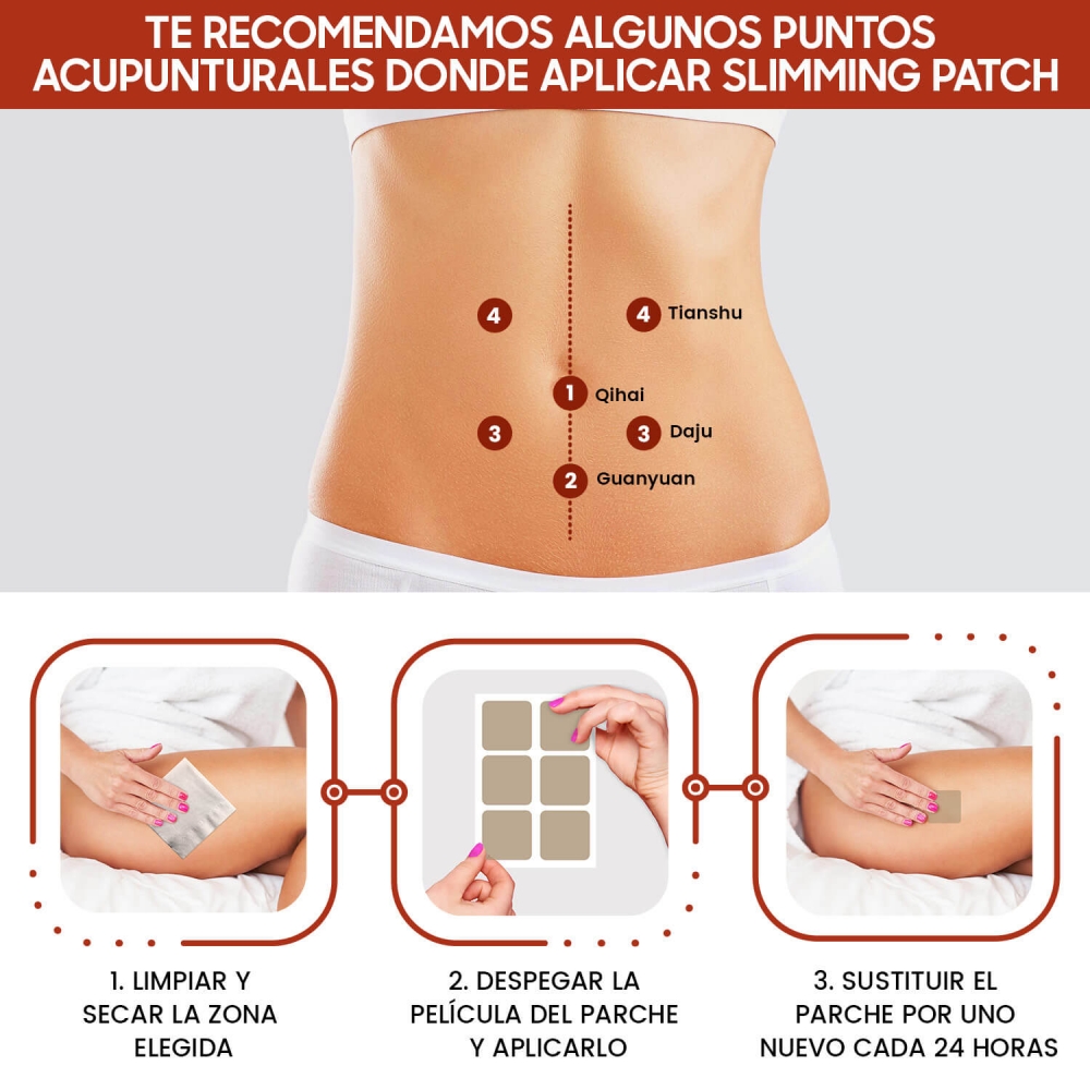 Cada envase contiene 60 parches adelgazantes efectivos, suficientes para un uso de 2 meses. Los parches son veganos, sin gluten ni OGM y aptos para adherir en cualquier parte del cuerpo libre de vello: abdomen, piernas, muslos, glúteos o brazos.