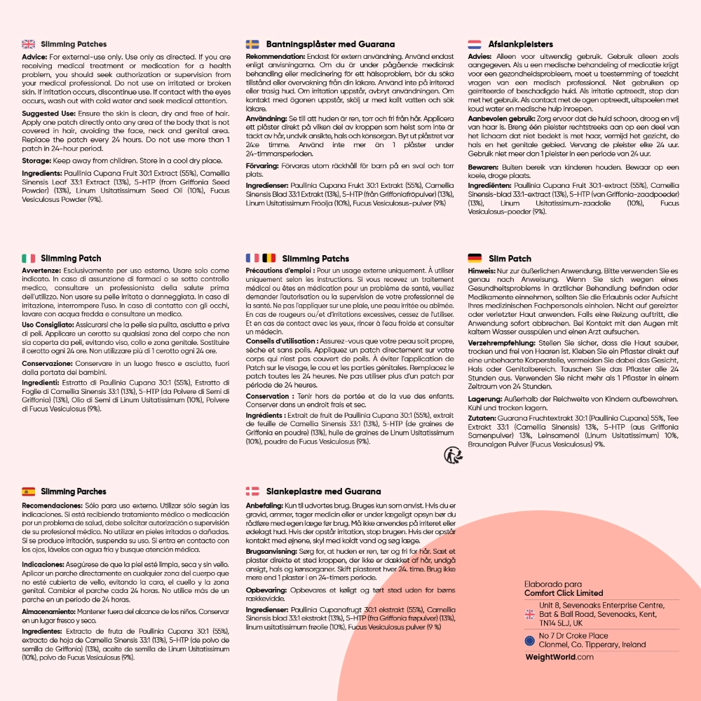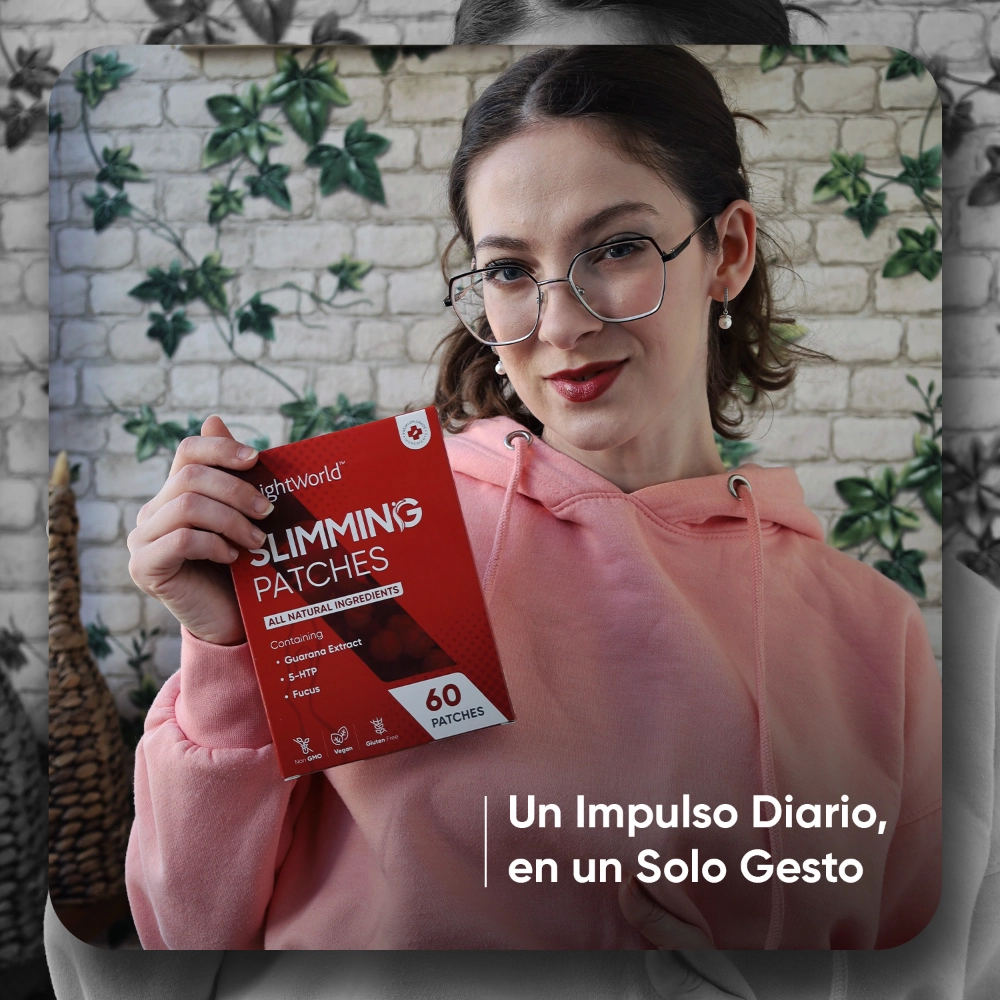 Los parches slimming de WeightWorld contienen ingredientes activos de origen natural como el extracto de guaraná, el 5 HTP y el fucus. El guaraná es conocido por su efecto estimulante natural que ayuda a mantenerte activo#; 5-HTP, un aminoácido relacionado con el equilibrio y el bienestar; y fucus, un alga marina tradicionalmente utilizada en hábitos de control y fuente de fibra#.