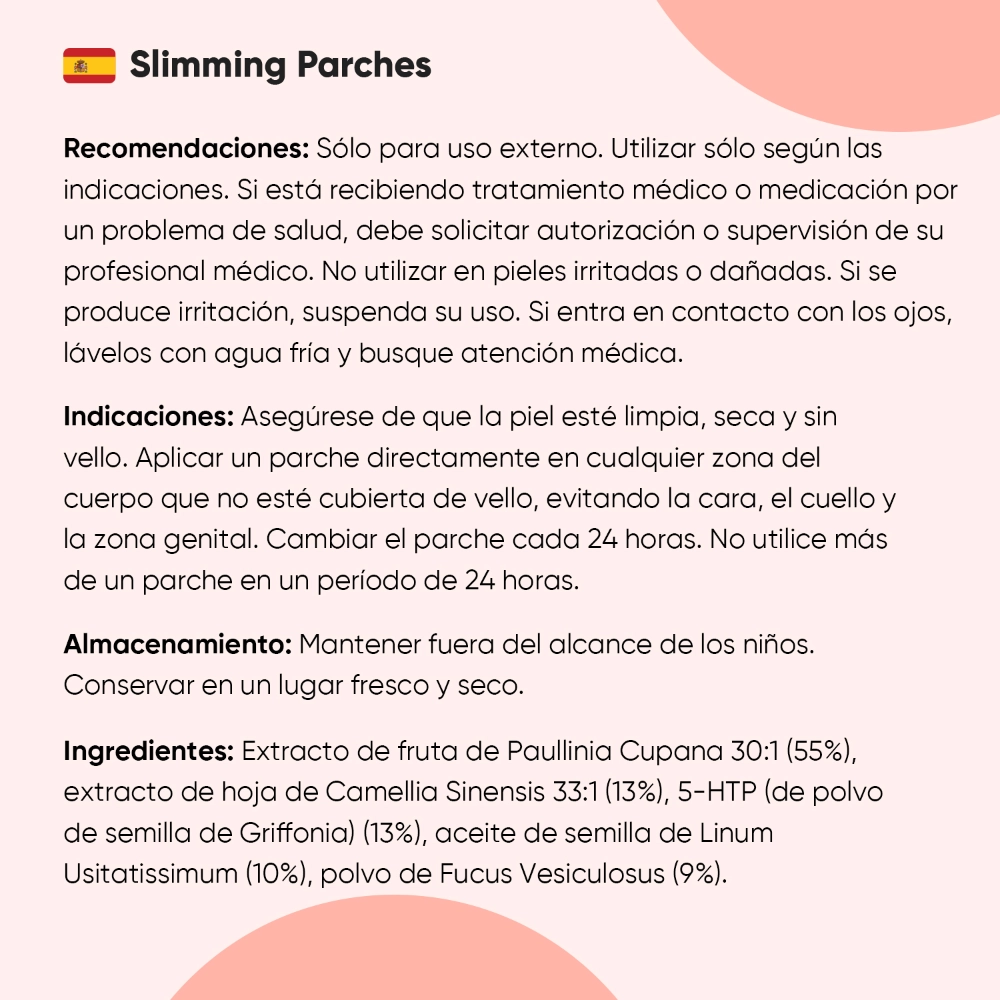 Cada envase contiene 60 parches efectivos, suficientes para un uso de 2 meses. Los parches son veganos, sin gluten ni OGM y aptos para adherir en cualquier parte del cuerpo libre de vello: abdomen, piernas, muslos, glúteos o brazos. Solo pegas un parches, te olvidas de él y…¡dejas que haga su trabajo mientras tú vives el tuyo! Una opción sencilla, cómoda y pensada para quienes buscan integrar buenos hábitos sin complicaciones.