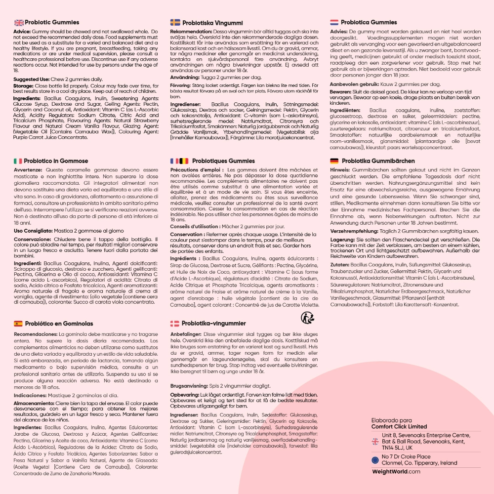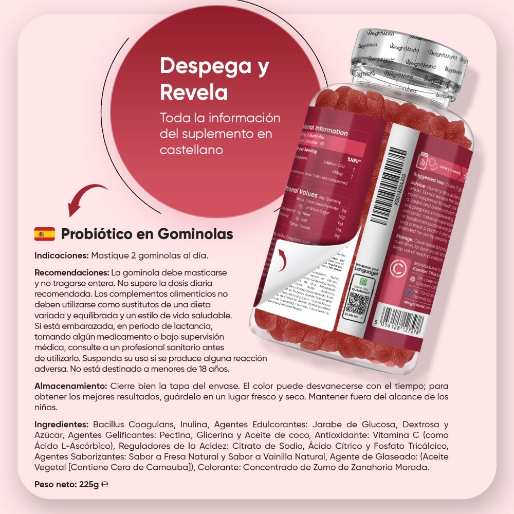 Bacillus Coagulans, Inulina, Agentes Edulcorantes: Jarabe de Glucosa, Dextrosa y Azúcar, Agentes Gelificantes: Pectina, Glicerina y Aceite de coco, Antioxidante: Vitamina C (como Ácido L-Ascórbico), Reguladores de la Acidez: Citrato de Sodio, Ácido Cítrico y Fosfato Tricálcico, Agentes Saborizantes: Sabor a Fresa Natural y Sabor a Vainilla Natural, Agente de Glaseado: (Aceite Vegetal [Contiene Cera de Carnauba]), Colorante: Concentrado de Zumo de Zanahoria Morada.Según las investigaciones, es mejor tomar los probióticos con el estómago vacío, ya que ayuda a los microbios buenos a llegar al intestino debido a un menor nivel de ácido en el estómago. Puedes consumir las gominolas probióticas antes del desayuno por la mañana o por la noche antes de irte a dormir para obtener los mejores resultados.