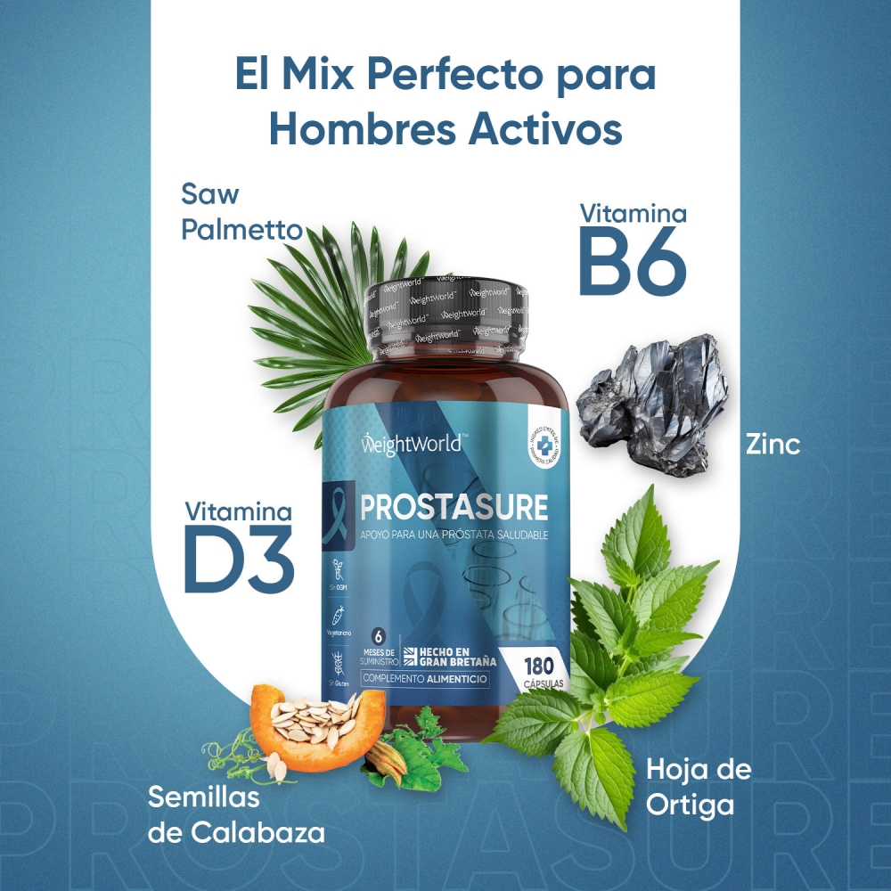 ¿Te sientes identificado? Entonces, te gustará saber acerca de ProstaSure, un suplemento formulado específicamente pensando en los hombres y en sus necesidades. Este complemento alimenticio en cápsulas ha sido diseñado para ayudar a la función normal de la próstata#. Contiene ingredientes como extracto de saw palmetto (serenoa repens), una palmera nativa americana que favorece la función saludable de la próstata#. También contiene extracto de hoja de ortiga, que apoya la función normal del tracto urinario#. En la fórmula de este suplemento para la próstata encontramos también polvo de semilla de calabaza, que contribuye al mantenimiento de la función urinaria en hombres mayores de 45 años#, y vitaminas y minerales como la vitamina B6, D3 y zinc.
