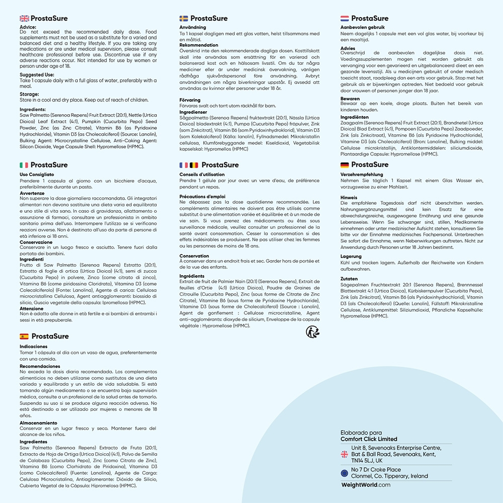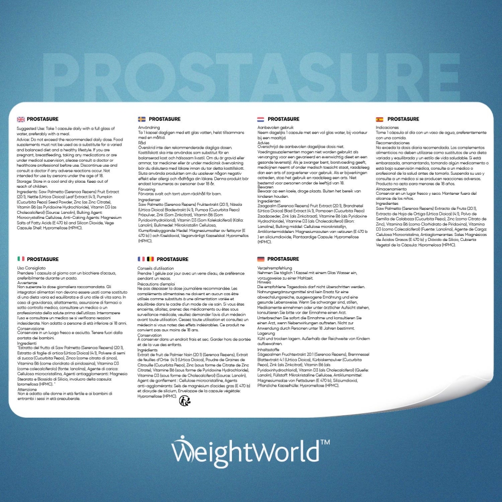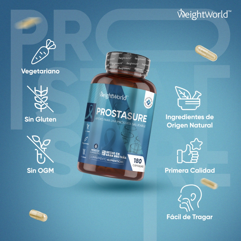 Cada envase de este suplemento contiene 180 cápsulas suficientes para 6 meses de suministro. ProstaSure de WeightWorld es apto para vegetarianos, está libre de gluten y de OGM. Tampoco contiene estearato de magnesio.