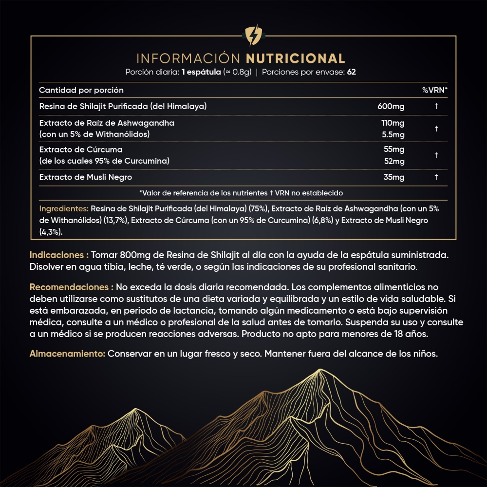 Tomar 800mg de Resina de Shilajit al día con la ayuda de la espátula suministrada. Disolver en agua tibia, leche, té verde, o según las indicaciones de su profesional sanitario.