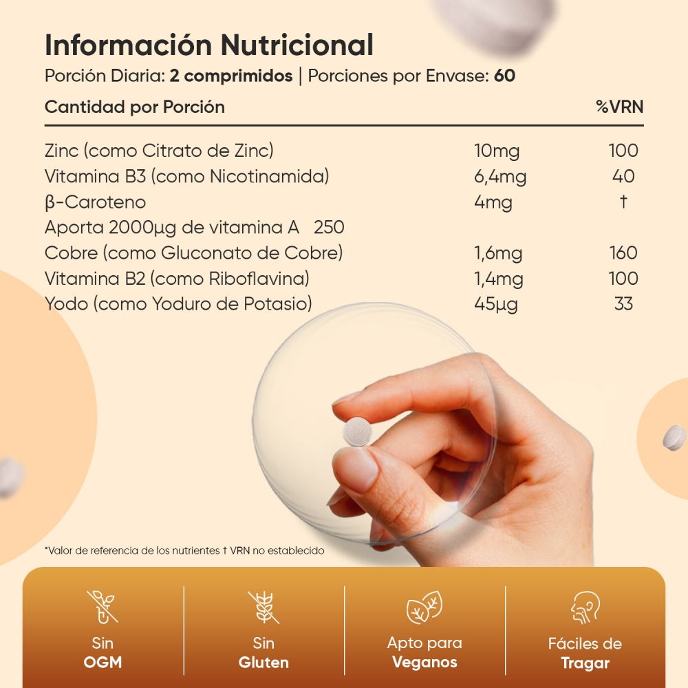 Zinc (como Citrato de Zinc), Vitamina B3 (como Nicotinamida), β-Caroteno: Proporcionando Vitamina A (como Acetato de Retinilo), Cobre (como Gluconato de Cobre), Vitamina B2 (como Riboflavina), Yodo (como Yoduro de Potasio), Agentes de Carga: Fosfato Dicálcico y Celulosa Microcristalina, Agentes Aglutinantes: Sales Magnésicas de Ácidos Grasos (E 470 b) y Dióxido de Silicio.