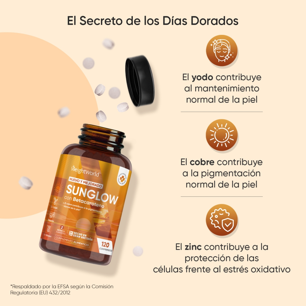 Sunglow de WeightWorld es un complemento alimenticio enriquecido con potentes ingredientes para preparar tu piel para la exposición solar. Estos comprimidos contienen betacaroteno, fuente de vitamina A que contribuye al mantenimiento de la piel en condiciones normales*, según afirma la Autoridad Europea de Seguridad Alimentaria (EFSA). La fórmula incluye también cobre, que contribuye a la pigmentación normal de la piel, vitaminas B2 y B3, yodo y zinc, que también contribuye al mantenimiento normal de la piel, de acuerdo con la EFSA.