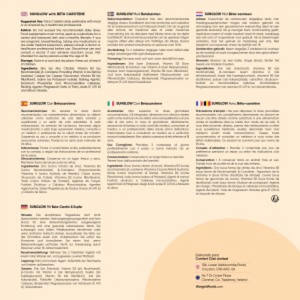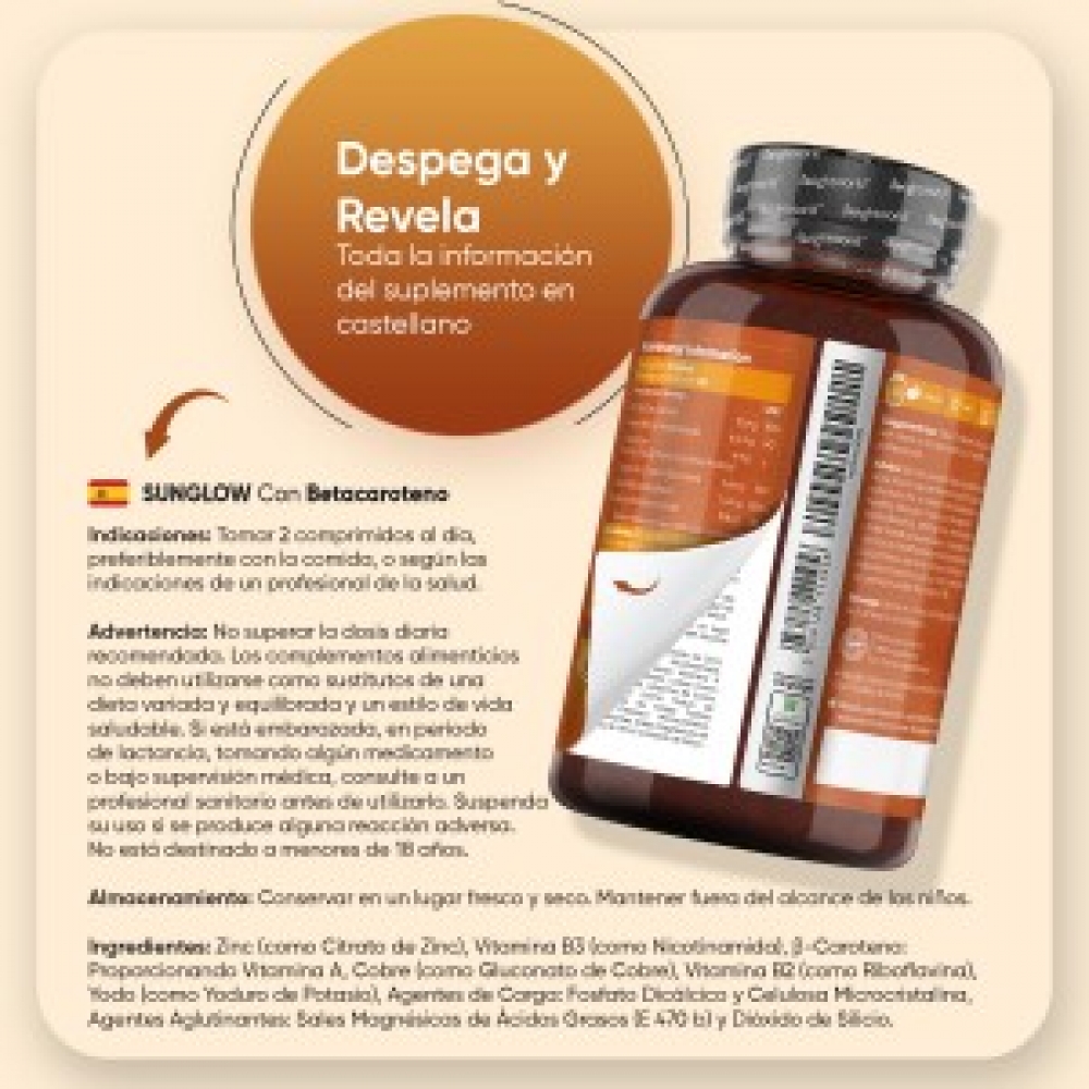 Cada envase de Sunglow contiene 120 comprimidos para 2 meses de suministro. Este suplemento con betacaroteno es apto para veganos, no contiene gluten ni OGM.