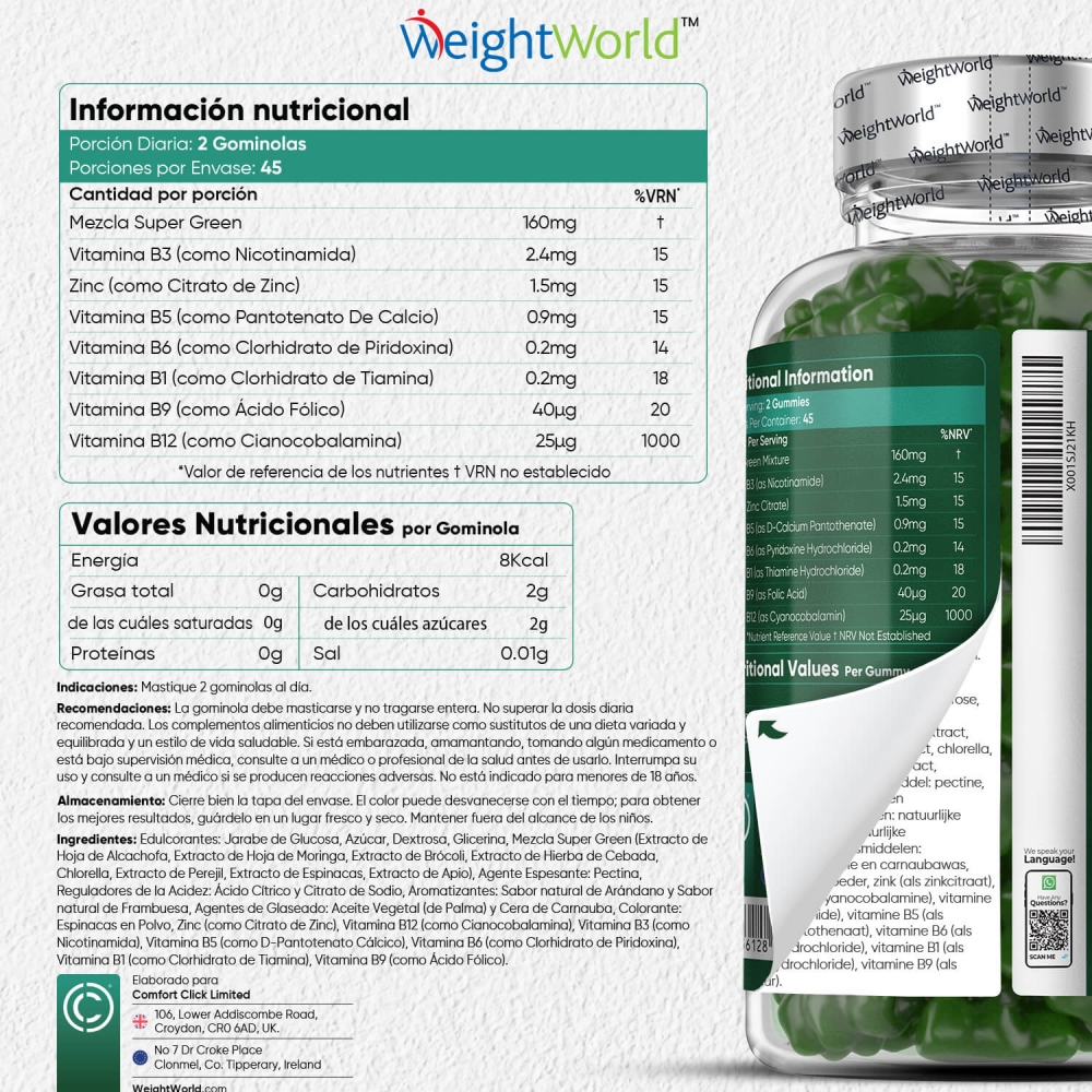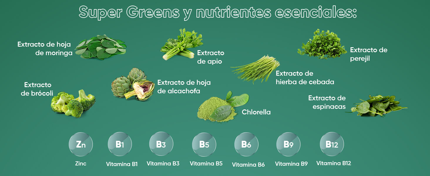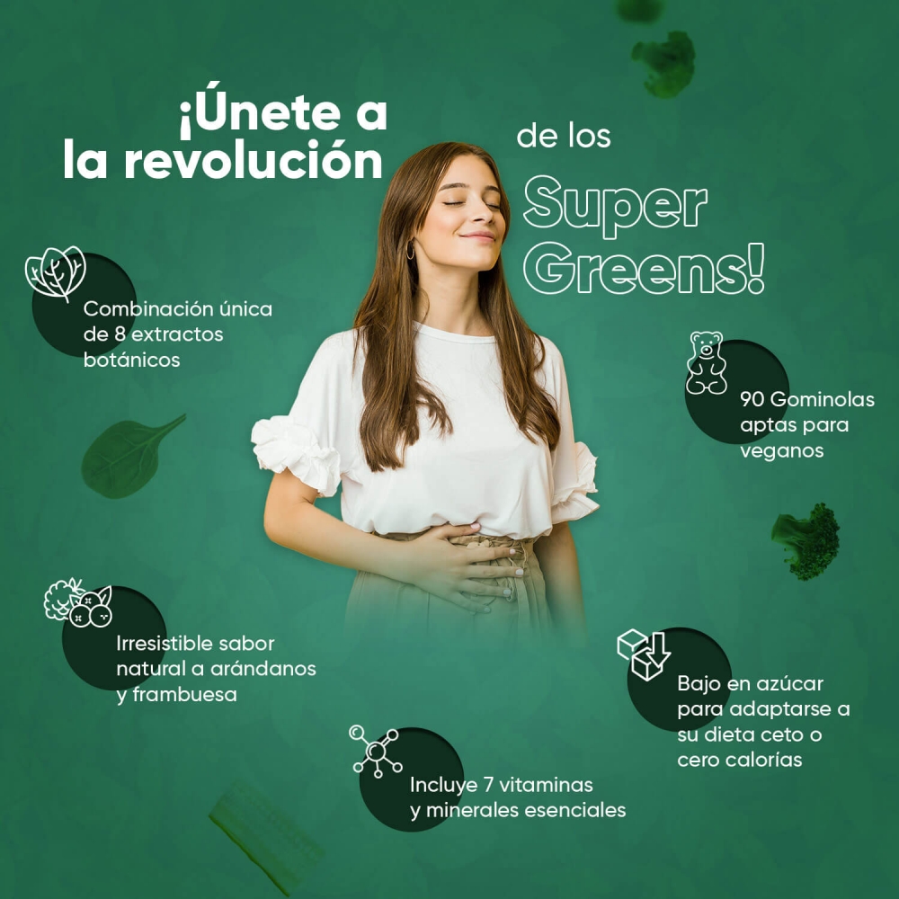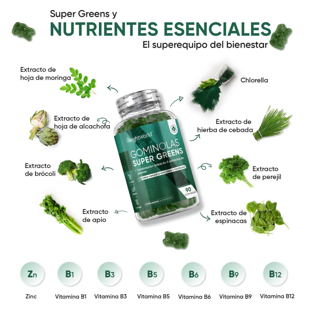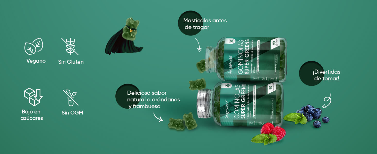 Edulcorantes: Jarabe de Glucosa, Azúcar, Dextrosa, Glicerina, Mezcla Super Green (Extracto de Hoja de Alcachofa, Extracto de Hoja de Moringa, Extracto de Brócoli, Extracto de Hierba de Cebada, Chlorella, Extracto de Perejil, Extracto de Espinacas, Extracto de Apio), Agente Espesante: Pectina, Reguladores de la Acidez: Ácido Cítrico y Citrato de Sodio, Aromatizantes: Sabor natural de Arándano y Sabor natural de Frambuesa, Agentes de Glaseado: Aceite Vegetal (de Palma) y Cera de Carnauba, Colorante: Espinacas en Polvo, Zinc (como Citrato de Zinc), Vitamina B12 (como Cianocobalamina), Vitamina B3 (como Nicotinamida), Vitamina B5 (como D-Pantotenato Cálcico), Vitamina B6 (como Clorhidrato de Piridoxina), Vitamina B1 (como Clorhidrato de Tiamina), Vitamina B9 (como Ácido Fólico).
