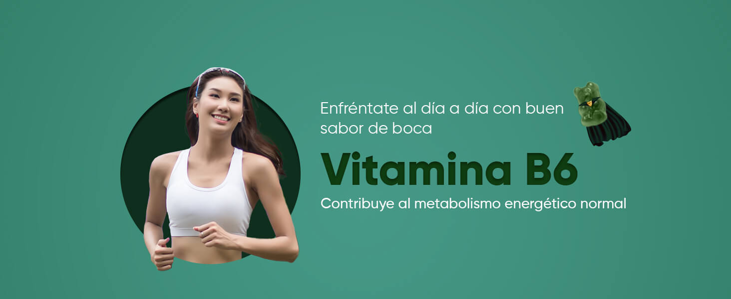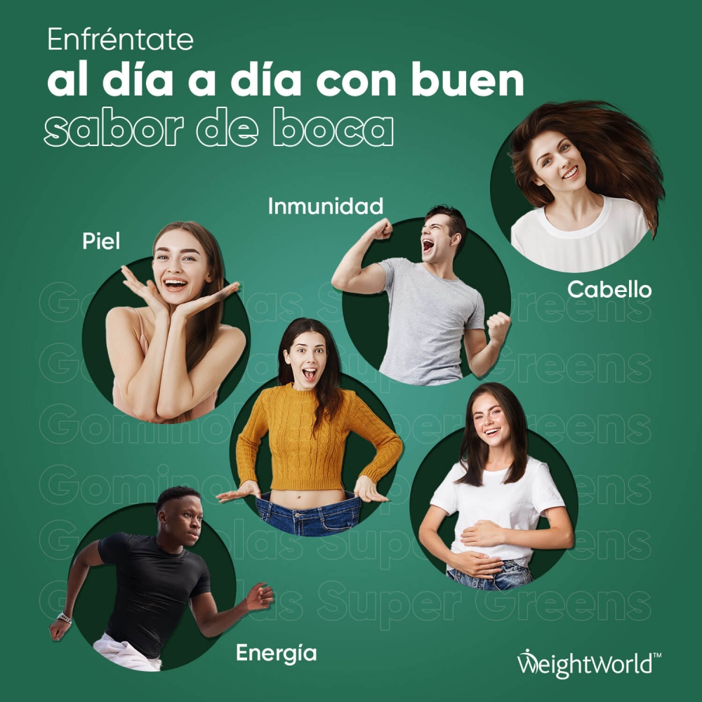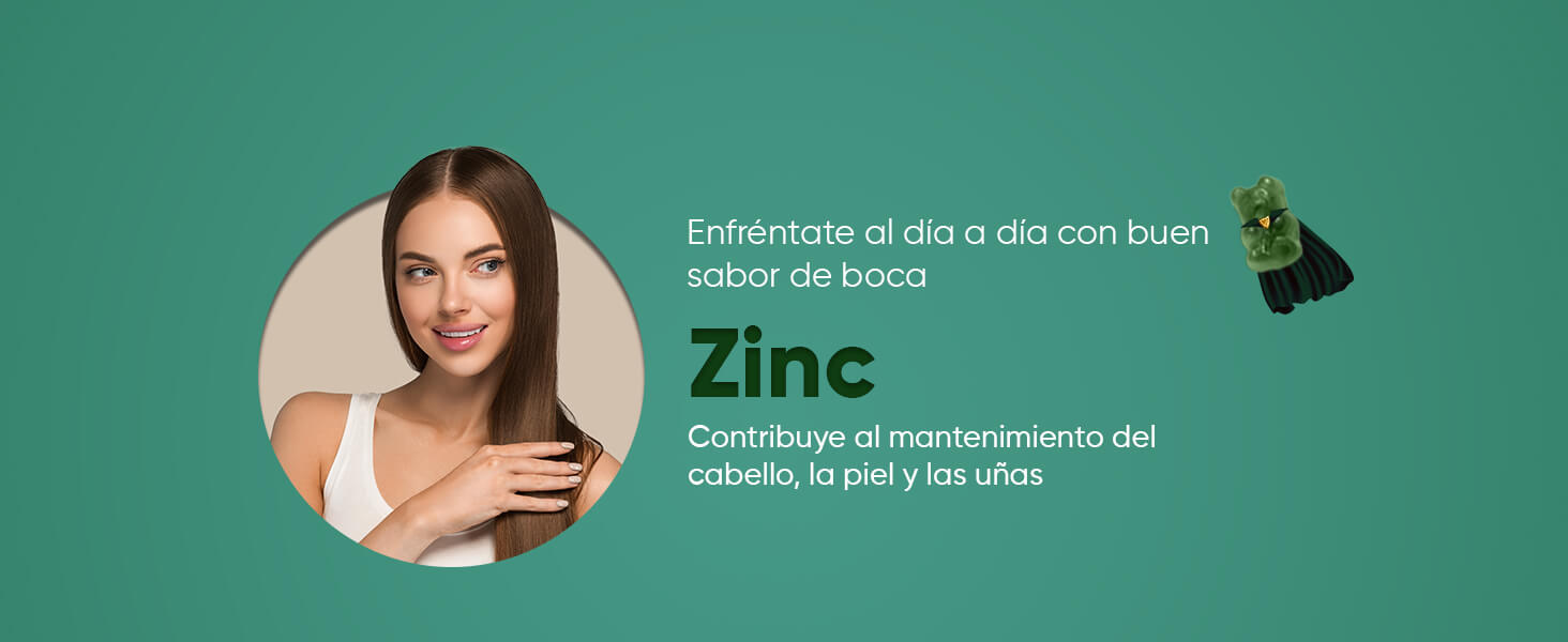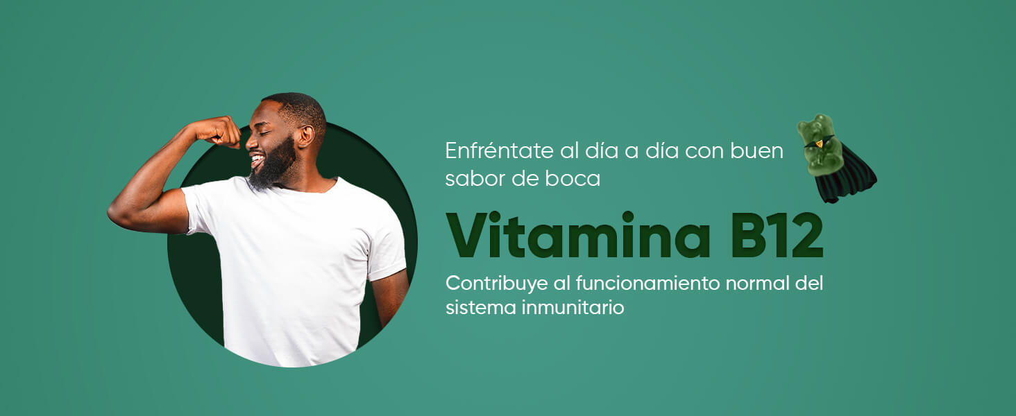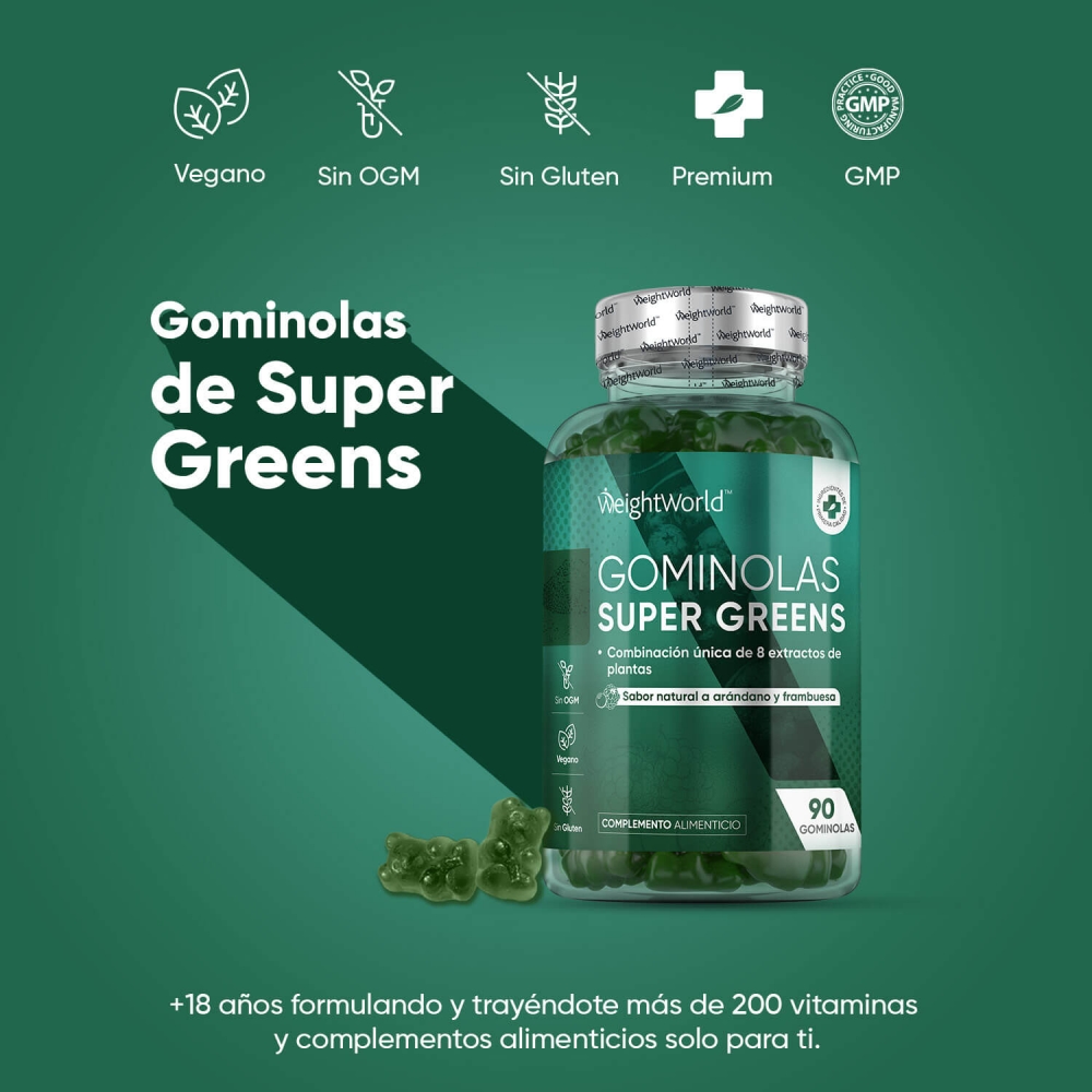Edulcorantes: Jarabe de Glucosa, Azúcar, Dextrosa, Glicerina, Mezcla Super Green (Extracto de Hoja de Alcachofa, Extracto de Hoja de Moringa, Extracto de Brócoli, Extracto de Hierba de Cebada, Chlorella, Extracto de Perejil, Extracto de Espinacas, Extracto de Apio), Agente Espesante: Pectina, Reguladores de la Acidez: Ácido Cítrico y Citrato de Sodio, Aromatizantes: Sabor natural de Arándano y Sabor natural de Frambuesa, Agentes de Glaseado: Aceite Vegetal (de Palma) y Cera de Carnauba, Colorante: Espinacas en Polvo, Zinc (como Citrato de Zinc), Vitamina B12 (como Cianocobalamina), Vitamina B3 (como Nicotinamida), Vitamina B5 (como D-Pantotenato Cálcico), Vitamina B6 (como Clorhidrato de Piridoxina), Vitamina B1 (como Clorhidrato de Tiamina), Vitamina B9 (como Ácido Fólico).