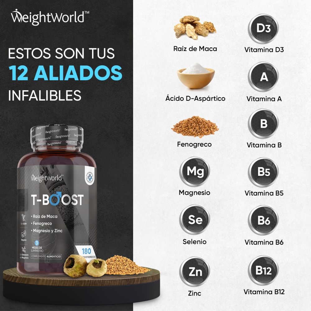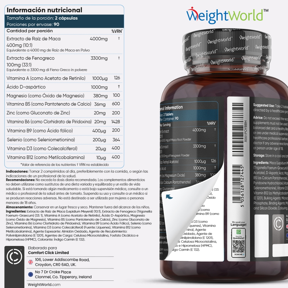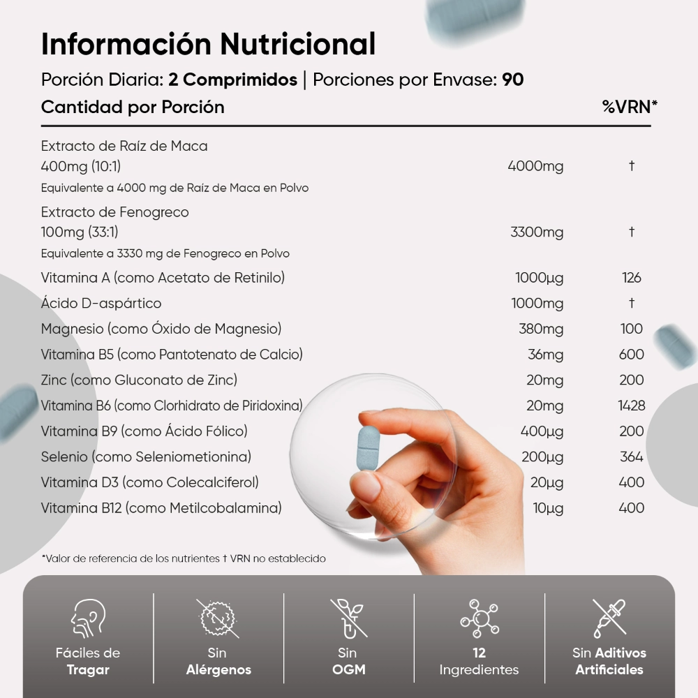 - Con 9 vitaminas y minerales, maca y fenogreco