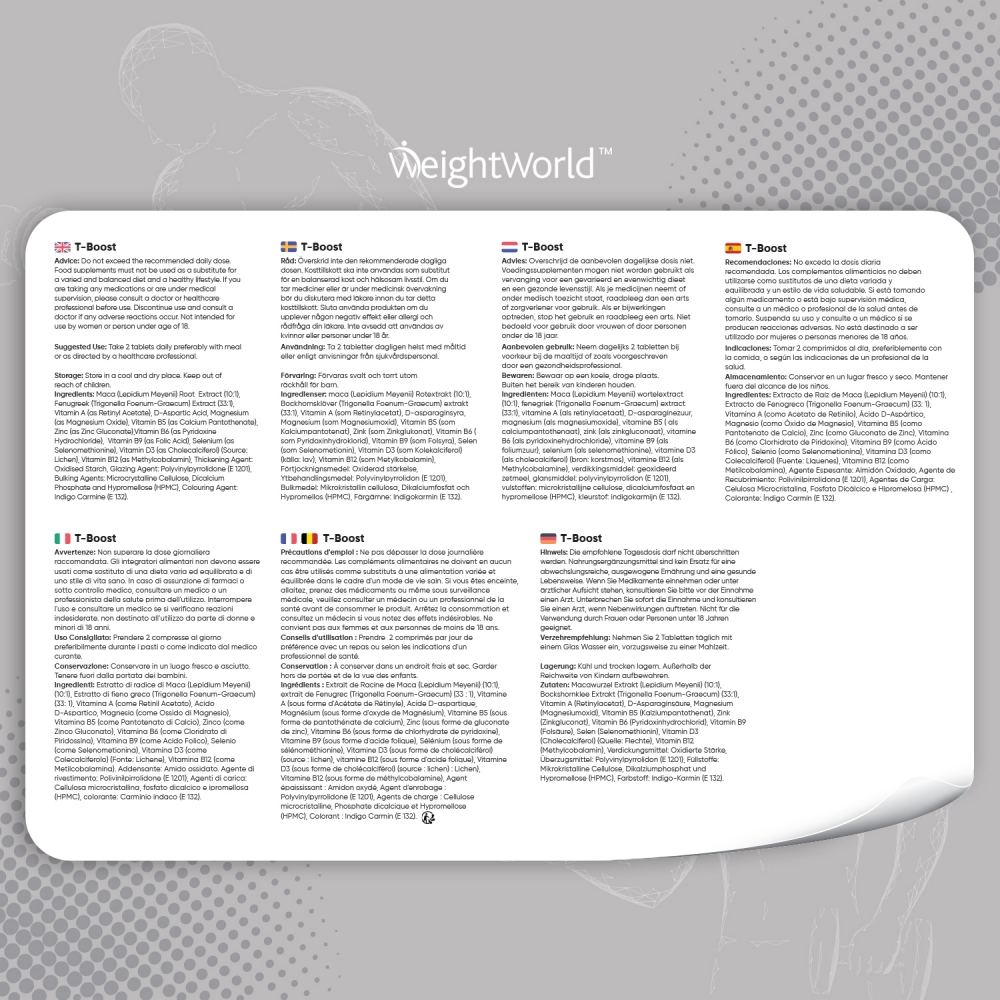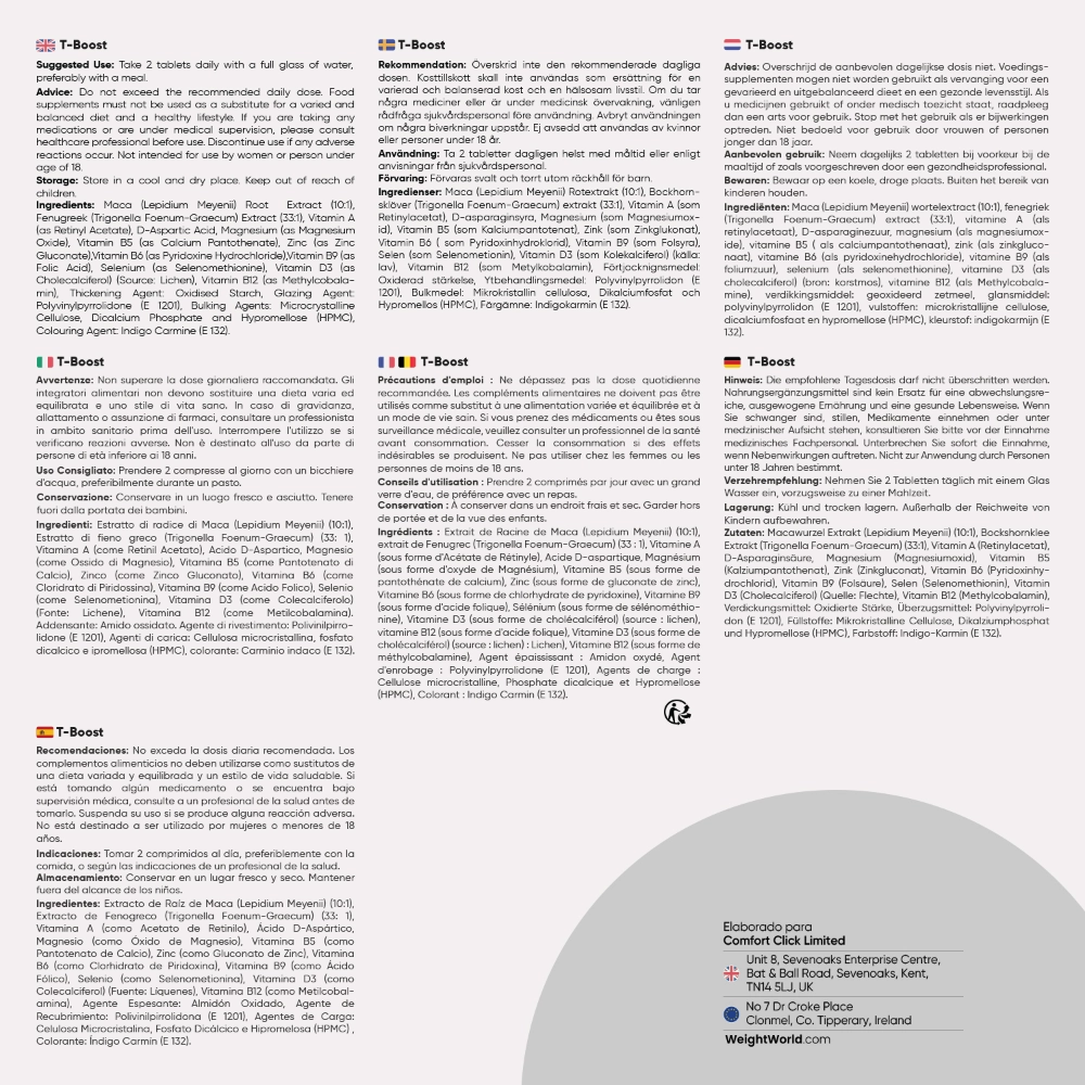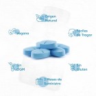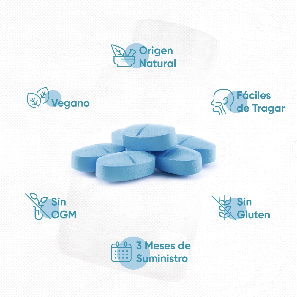 Extracto de Raíz de Maca (Lepidium Meyenii) (10:1), Extracto de Fenogreco (Trigonella Foenum-Graecum) (33: 1), Vitamina A (como Acetato de Retinilo), Ácido D-Aspártico, Magnesio (como Óxido de Magnesio), Vitamina B5 (como Pantotenato de Calcio), Zinc (como Gluconato de Zinc), Vitamina B6 (como Clorhidrato de Piridoxina), Vitamina B9 (como Ácido Fólico), Selenio (como Selenometionina), Vitamina D3 (como Colecalciferol) (Fuente: Líquenes), Vitamina B12 (como Metilcobalamina), Agente Espesante: Almidón Oxidado, Agente de Recubrimiento: Polivinilpirrolidona (E 1201), Agentes de Carga: Celulosa Microcristalina, Fosfato Dicálcico e Hipromelosa (HPMC) , Colorante: Índigo Carmín (E 132).