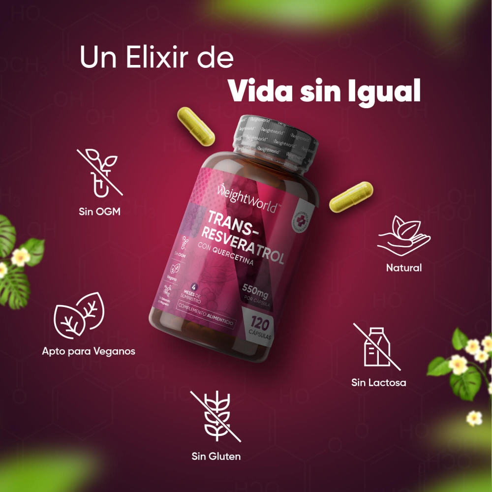 Nuestro suplemento de Trans Resveratrol ofrece una de las dosis más potentes del mercado. Cada cápsula aporta 500 mg de este polifenol. Además, se acompaña de quercetina, un flavonoide que favorece la biodisponibilidad del resveratrol y también tiene beneficios antioxidantes y apoya el sistema nervioso y la salud del corazón.
