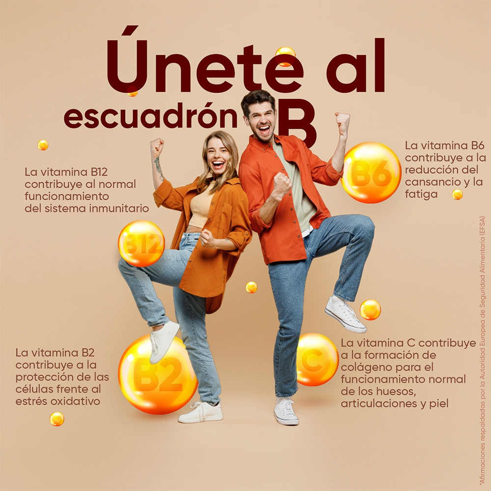 - Las vitaminas B2, B12, y B6 contribuyen a la reducción del cansancio y la fatiga*.