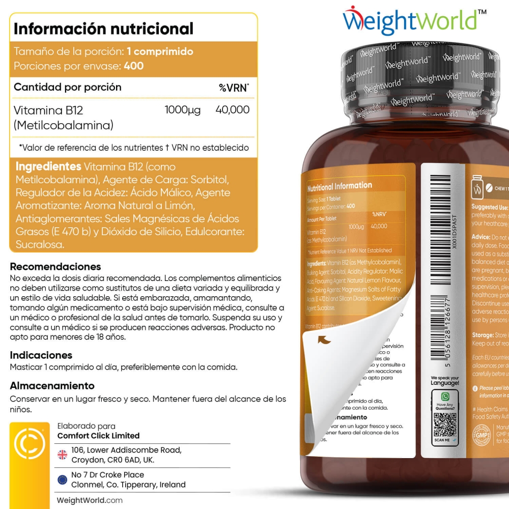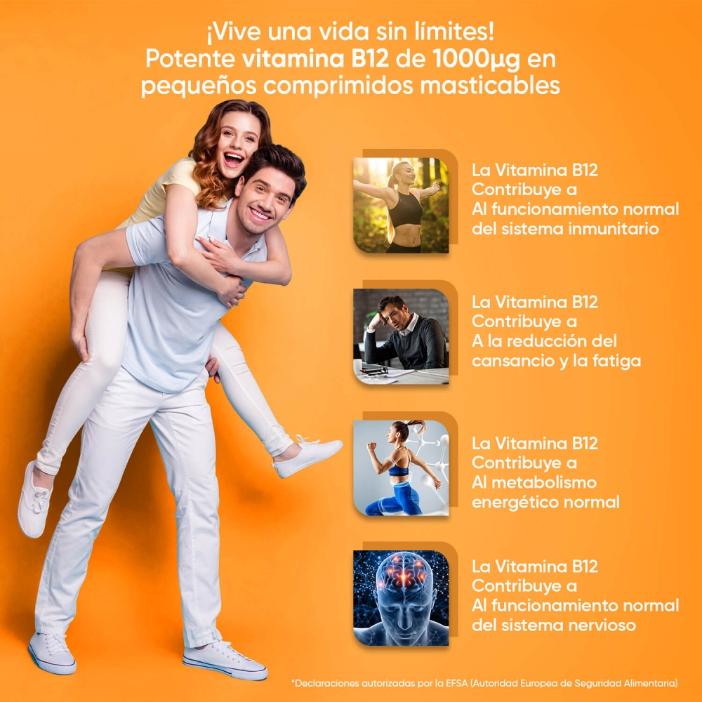- Potente dosis de 1000 mcg de vitamina B12 por comprimido