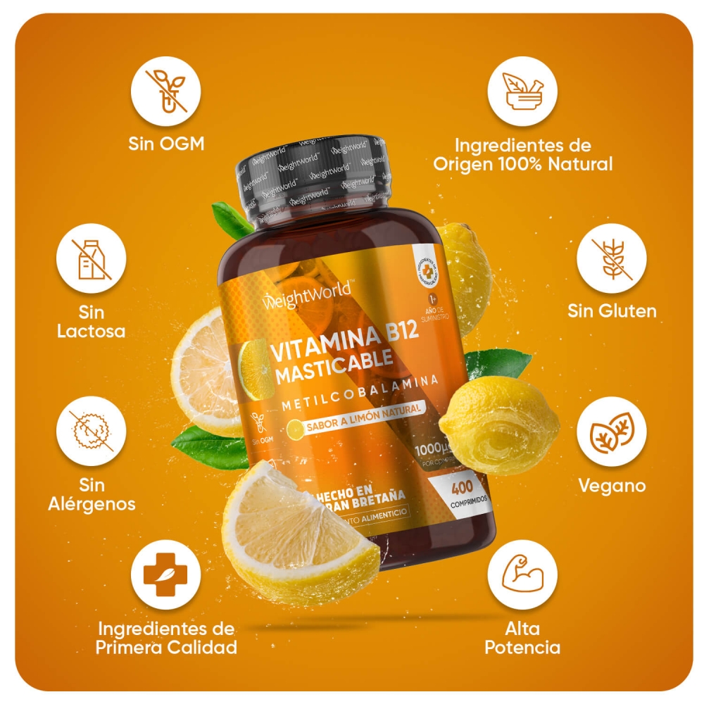 Vitamina B12 (como Metilcobalamina), Agente de Carga: Sorbitol, Regulador de la Acidez: Ácido Málico, Agente Aromatizante: Aroma Natural a Limón, Antiaglomerantes: Sales Magnésicas de Ácidos Grasos (E 470 b) y Dióxido de Silicio, Edulcorante: Sucralosa.