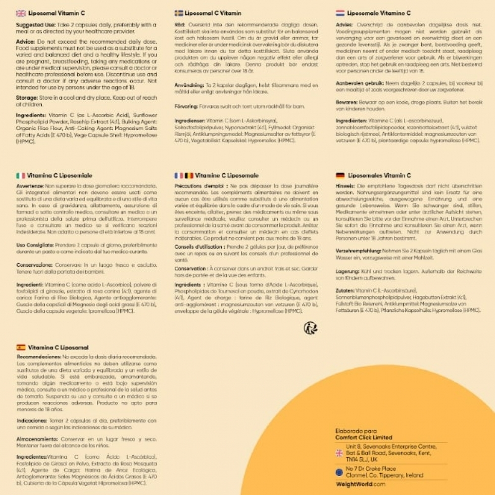 Al elegir el suplemento de apoyo interno más eficaz, dos factores pueden marcar una gran diferencia en el bienestar general: la potencia y la biodisponibilidad. El suplemento de Vitamina C Liposomal de WeightWorld contiene 1000 mg de vitamina C liposomal de primera calidad en cada porción (2 cápsulas al día).