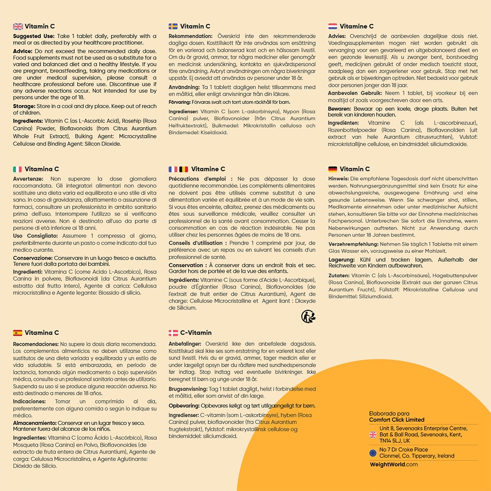 Los comprimidos de Vitamina C con Rosa Mosqueta y Bioflavonoides vienen avalados por WeightWorld, tu marca de confianza presente en el mercado desde el año 2006. Más de 15 años de historia garantizan la máxima calidad de todos nuestros suplementos y productos, formulados con ingredientes de origen natural y sin OGM. Miles de clientes en más de una decena de países han depositado ya su confianza y bienestar en nosotros.
