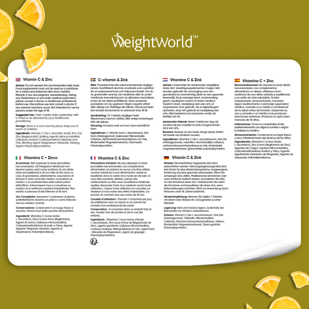 Vitamina C (como ácido L-ascórbico), zinc (como bisglicinato de zinc), agentes de carga: celulosa microcristalina, carboximetilcelulosa sódica y talco, agente de recubrimiento: Polivinilpirrolidona.