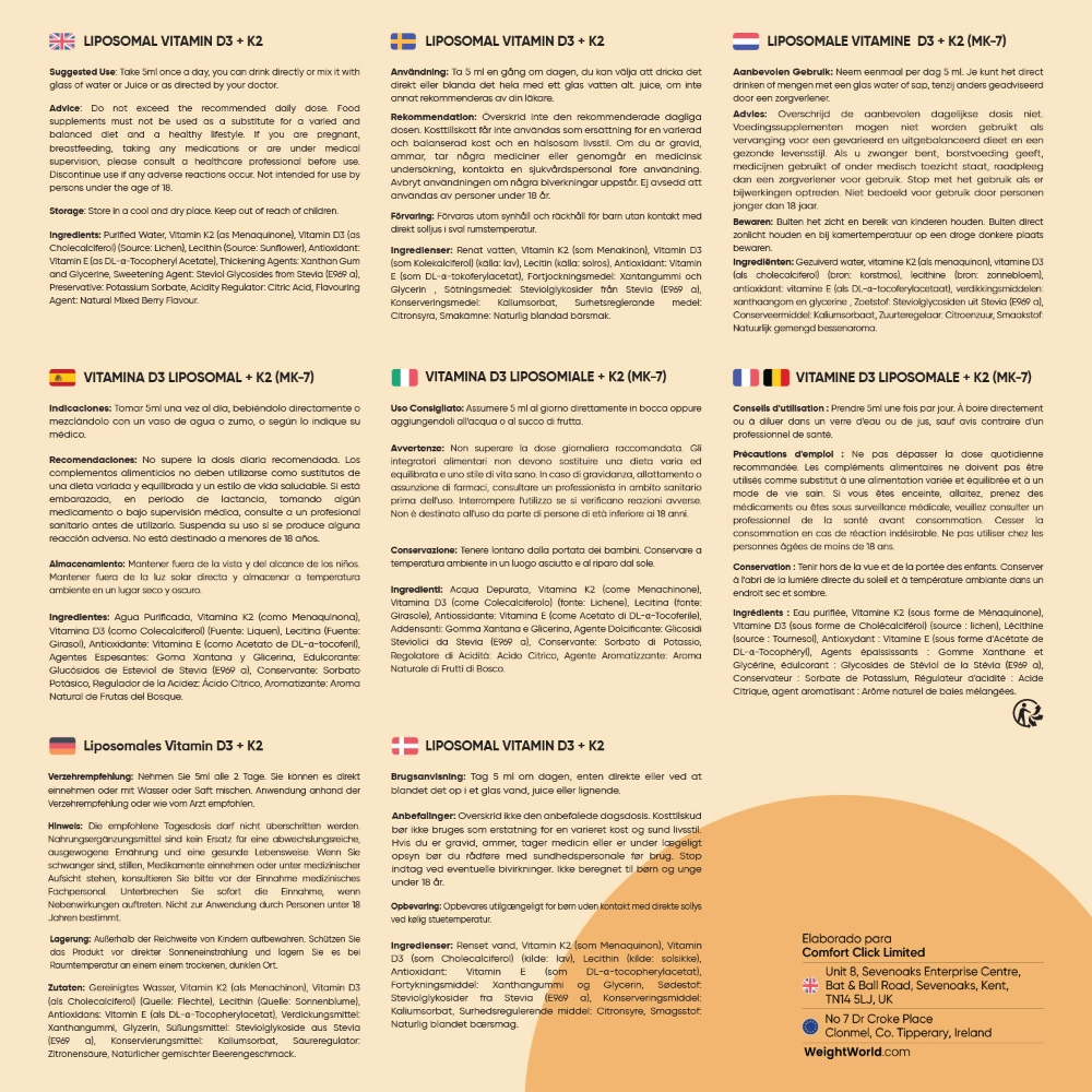 Agua Purificada, Vitamina K2 (como Menaquinona), Vitamina D3 (como Colecalciferol) (Fuente: Liquen), Lecitina (Fuente: Girasol), Antioxidante: Vitamina E (como Acetato de DL-α-tocoferil), Agentes Espesantes: Goma Xantana y Glicerina, Edulcorante: Glucósidos de Esteviol de Stevia (E969 a), Conservante: Sorbato Potásico, Regulador de la Acidez: Ácido Cítrico, Aromatizante: Aroma Natural de Frutas del Bosque.