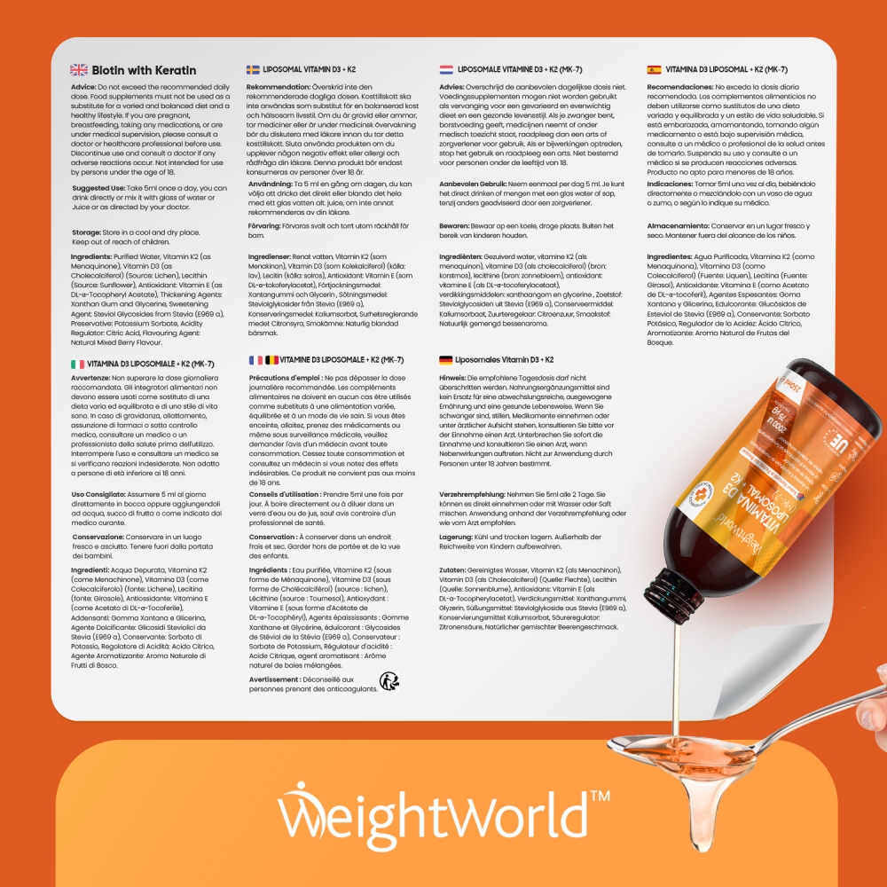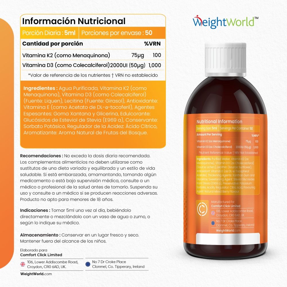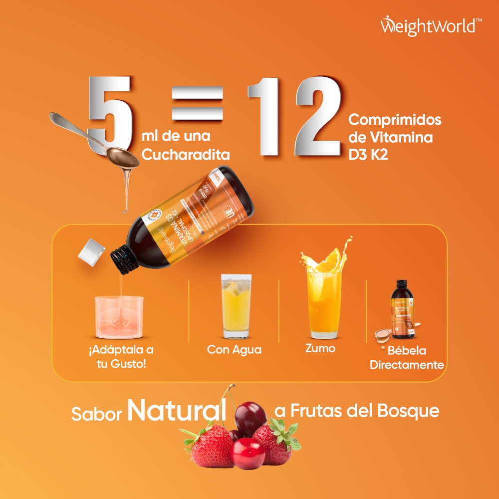La vitamina D3 y K2 viene avalada por WeightWorld, tu marca de confianza presente en el mercado desde el año 2006. Más de 15 años de historia garantizan la máxima calidad de todos nuestros suplementos y productos, formulados con ingredientes de origen natural y sin OGM. Miles de clientes en más de una decena de países han depositado ya su confianza y bienestar en nosotros.