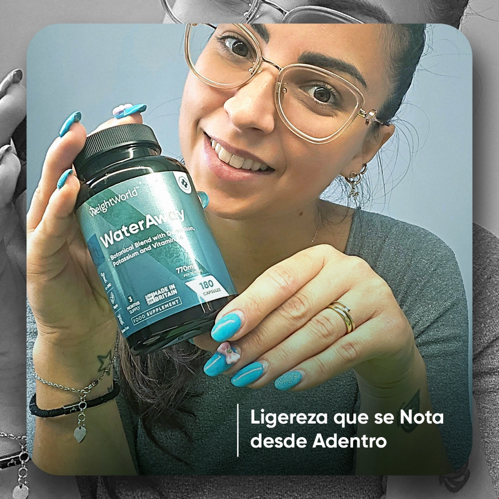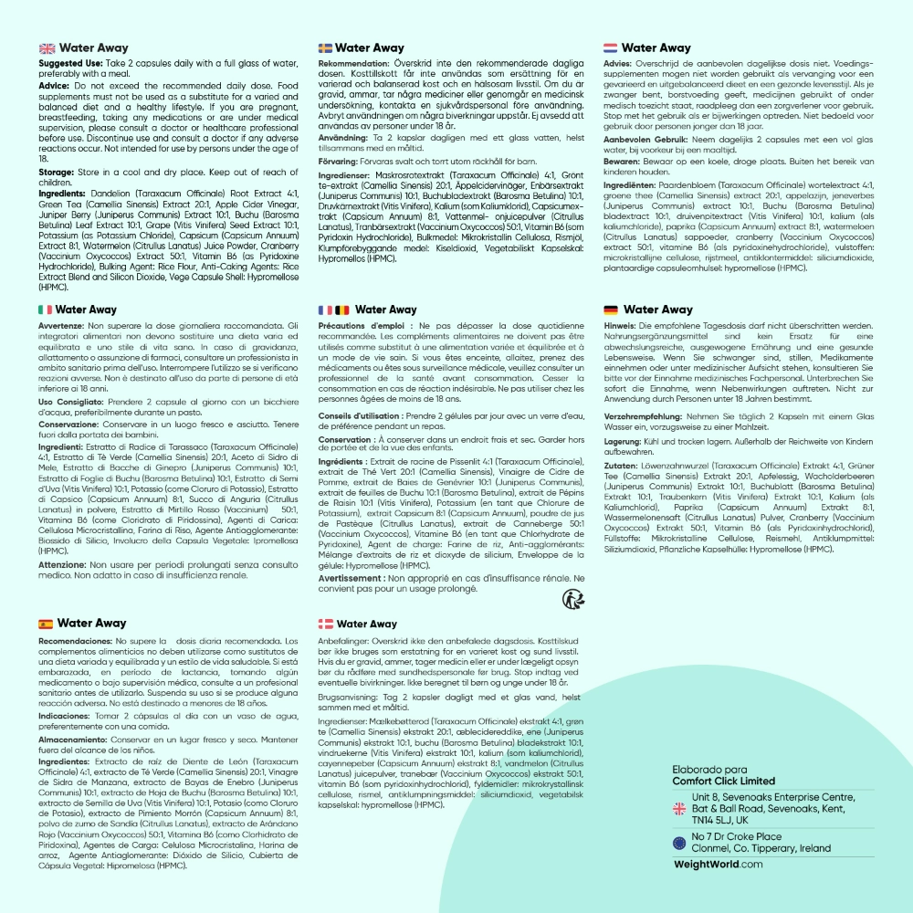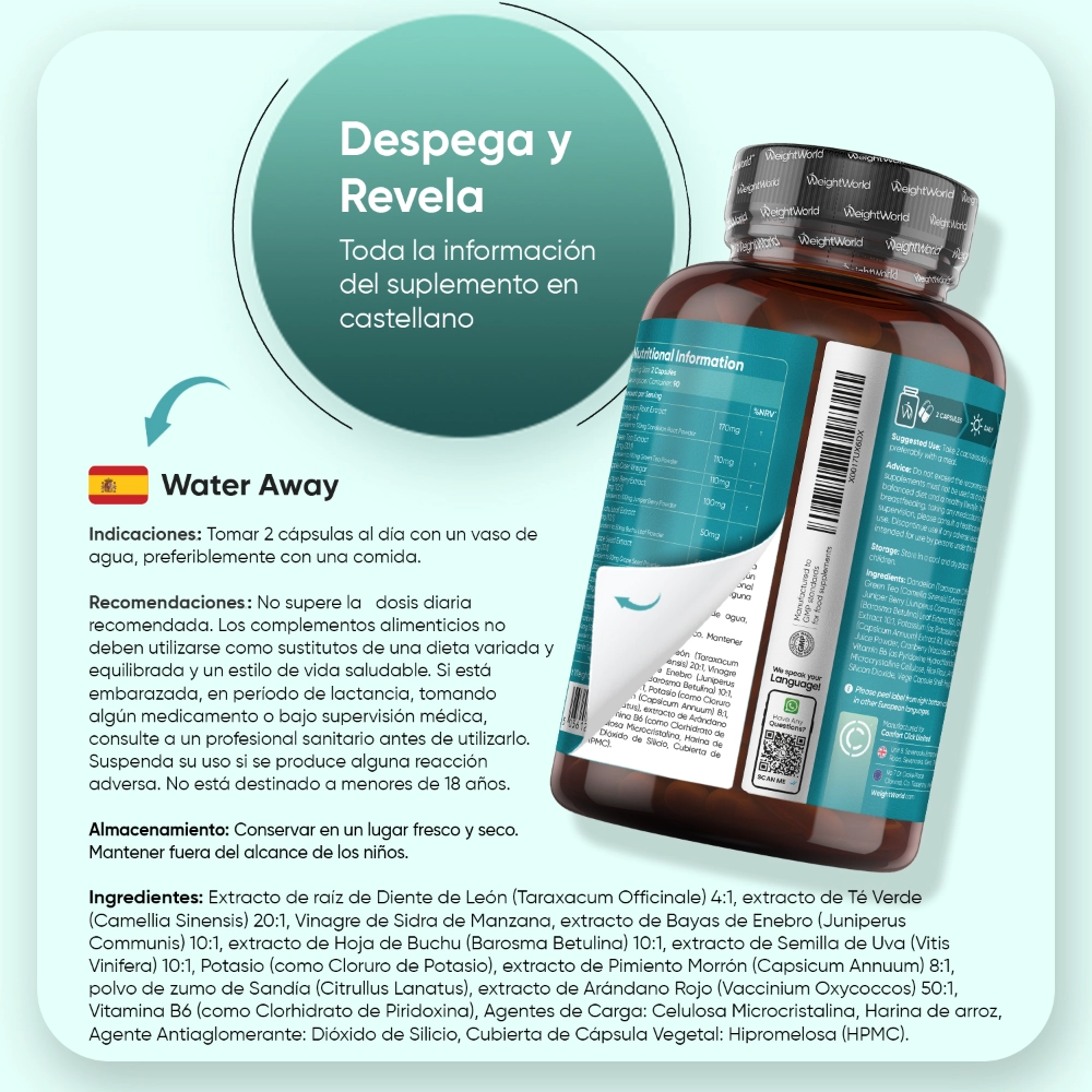 Extracto de raíz de Diente de León (Taraxacum Officinale) 4:1, extracto de Té Verde (Camellia Sinensis) 20:1, Vinagre de Sidra de Manzana, extracto de Bayas de Enebro (Juniperus Communis) 10:1, extracto de Hoja de Buchu (Barosma Betulina) 10:1, extracto de Semilla de Uva (Vitis Vinifera) 10:1, Potasio (como Cloruro de Potasio), extracto de Pimiento Morrón (Capsicum Annuum) 8:1, polvo de zumo de Sandía (Citrullus Lanatus), extracto de Arándano Rojo (Vaccinium Oxycoccos) 50:1, Vitamina B6 (como Clorhidrato de Piridoxina), Agentes de Carga: Celulosa Microcristalina, Harina de arroz, Agente Antiaglomerante: Dióxido de Silicio, Cubierta de Cápsula Vegetal: Hipromelosa (HPMC).
