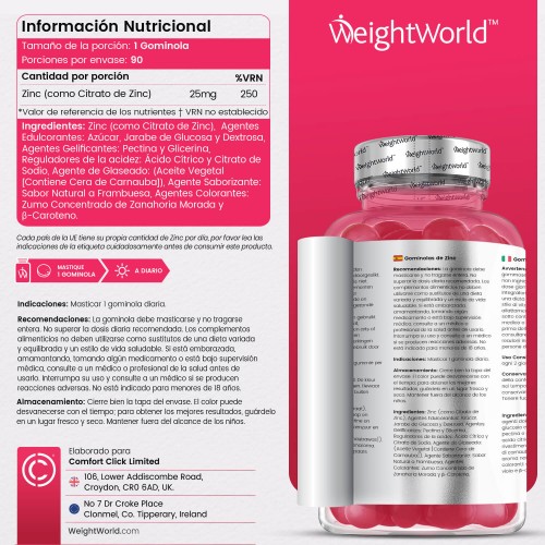 Zinc (como Citrato de Zinc), Agentes Edulcorantes: Azúcar, Jarabe de Glucosa y Dextrosa, Agente Gelificantes: Pectina, Reguladores de la acidez: Ácido Cítrico y Citrato de Sodio, Agente de Glaseado: (Aceite Vegetal [Contiene Cera de Carnauba]), Agente Saborizante: Sabor Natural a Frambuesa, Colorantes: Concentrado de zumo de frutas y verduras.